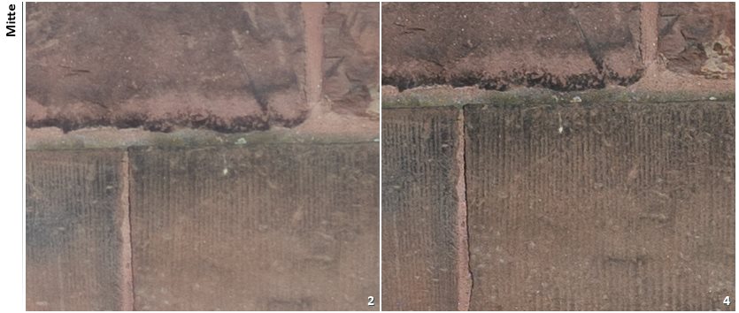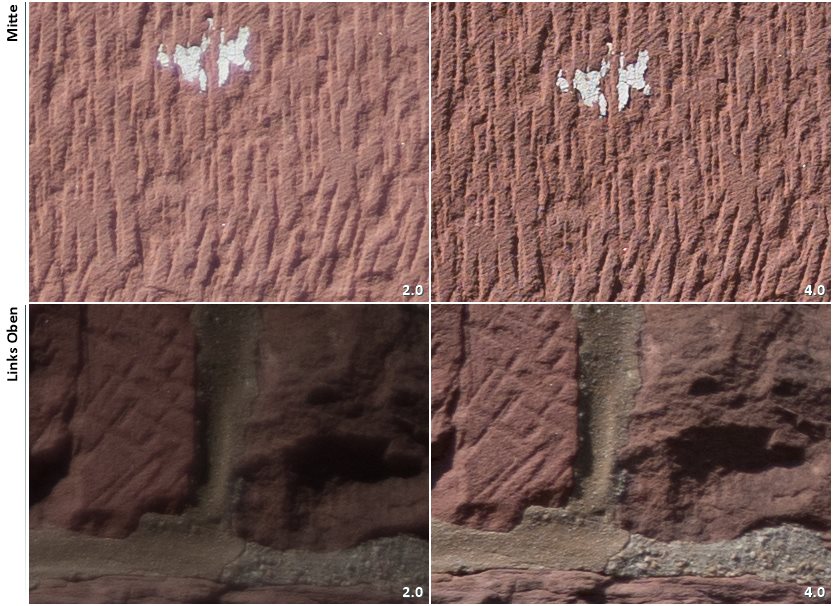 Bei 2.0 ist noch eine deutliche Vignettierung vorhanden. Und wie auch in den Crops zusehen, ist der Kontrast noch gering: