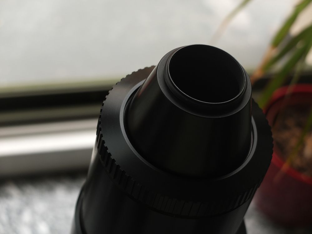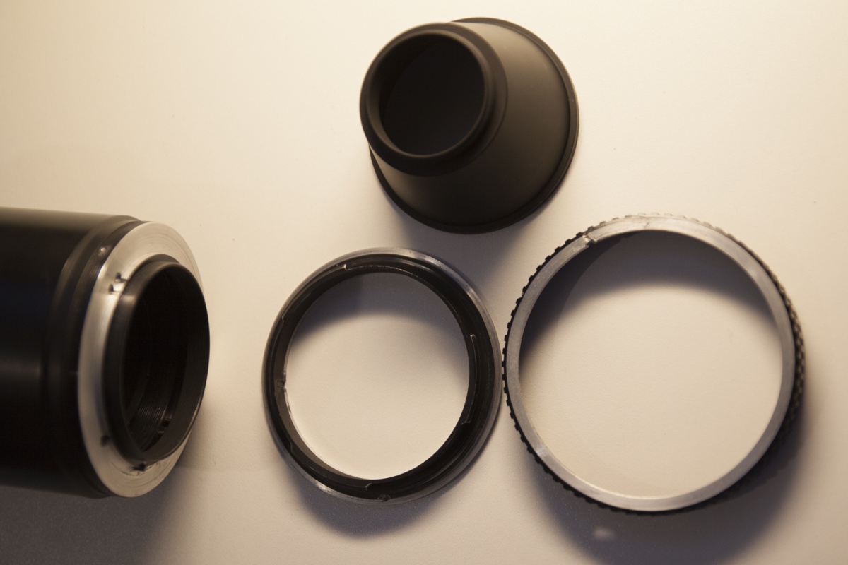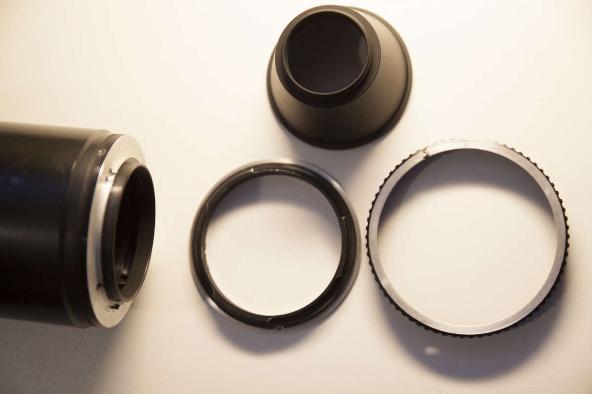 Ich löse die Schraube in dem Überwurfring, nehme den Ring ab, nehme den Bajonetanschluß runter, setze den M42 Adapter rauf.