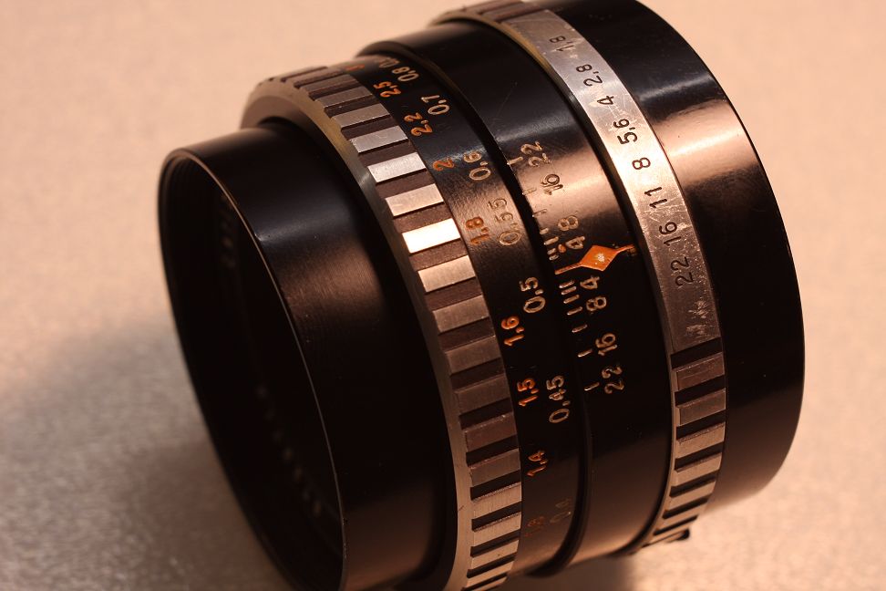 Die erste Ausführung des f/1,8 50mm war das Pancolar im Zebra Design und in "flacher" Bauweise. Von den Gehäuseabmessungen entsprach es in etwa dem Tessar selber Generation. Zu erkennen ist es an 4 markanten Merkmalen: