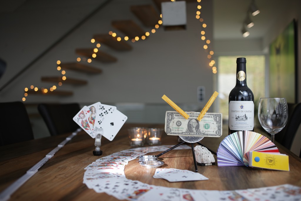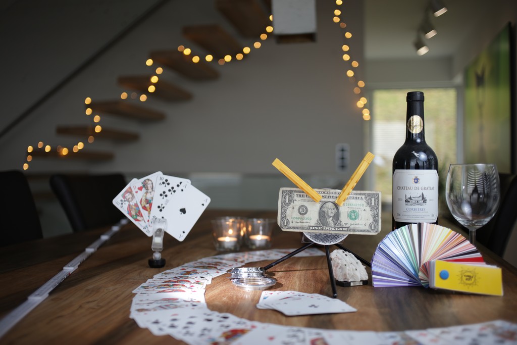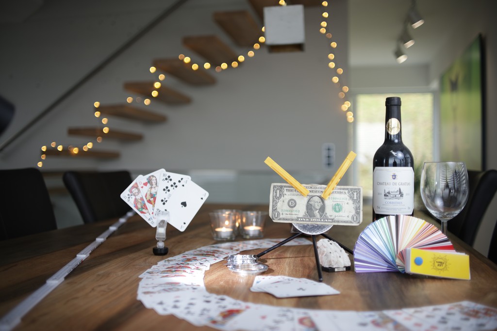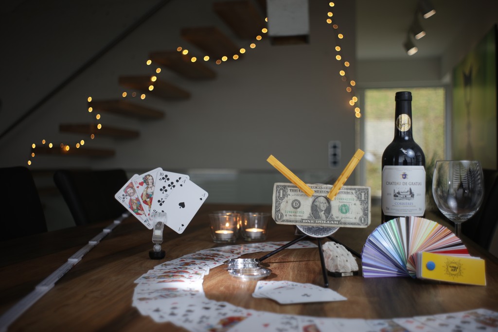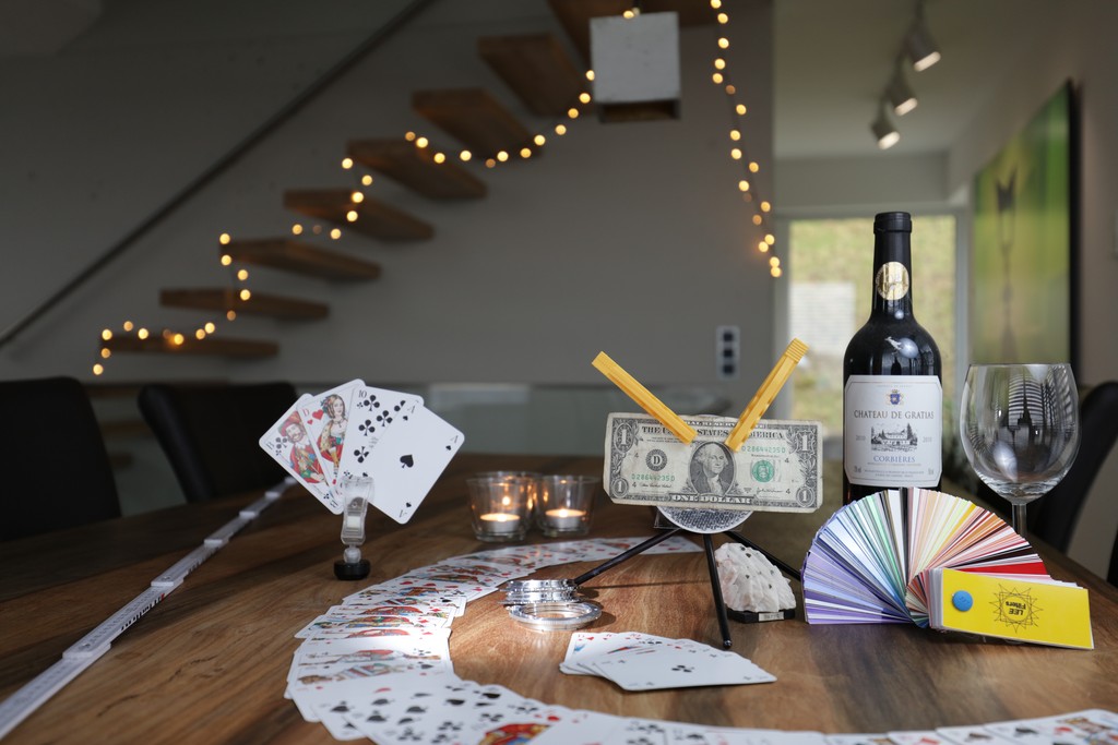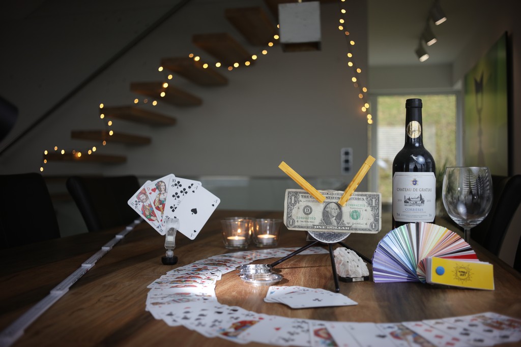 Der Geldschein selbst liegt in seiner gesamten Fläche nur ungefähr parallel zur Sensorebene. Ebenso befinden sich die platzierten Gegenstände nicht zwingend in der Schärfeebene bzw. im Schärfekonus. Die Weinflasche befindet sich z.B. absichtlich etwas hinter der Schärfeebene, um den Übergang beurteilen zu können.