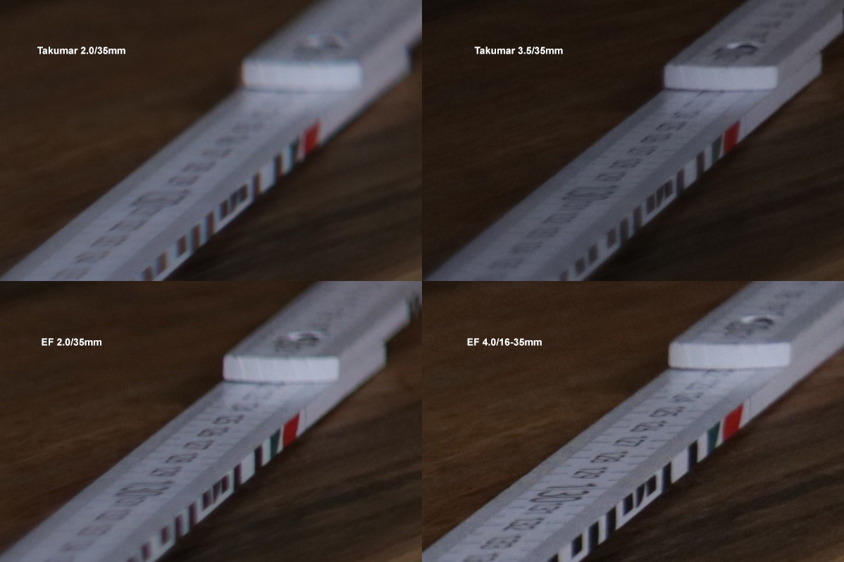 Die Objektive mussten alle mit Blende 2.8 zum Test antreten. Lichtstärkere Objektive wurden entsprechend abgeblendet. Lichtschwächere Objektive habe ich mit ihrer Anfangslichtstärke getestet. Dazu wurde der ISO-Wert der Kamera angepasst, um ansonsten die Parameter (auch am Blitz) gleich zu belassen. Das 3.5/35mm Takumar wurde z.B. mit ISO 160 anstatt ISO 100 getestet. Bei den 4.0 Zooms dann entsprechend ISO 200.