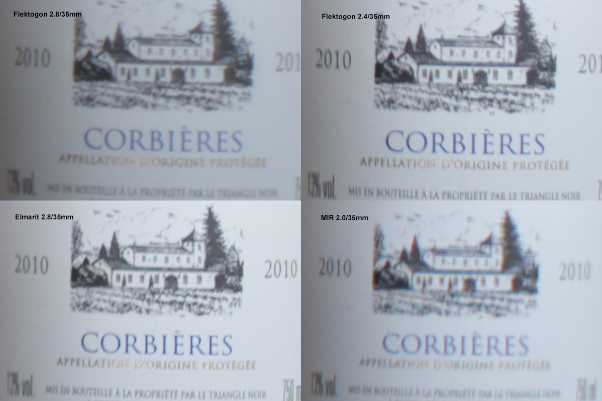 Gefolgt von einer Gegenüberstellung des Verhaltens in der Schärfeübergangszone. Das Etikett der Weinflasche liegt ca. 5cm hinter der Schärfe.