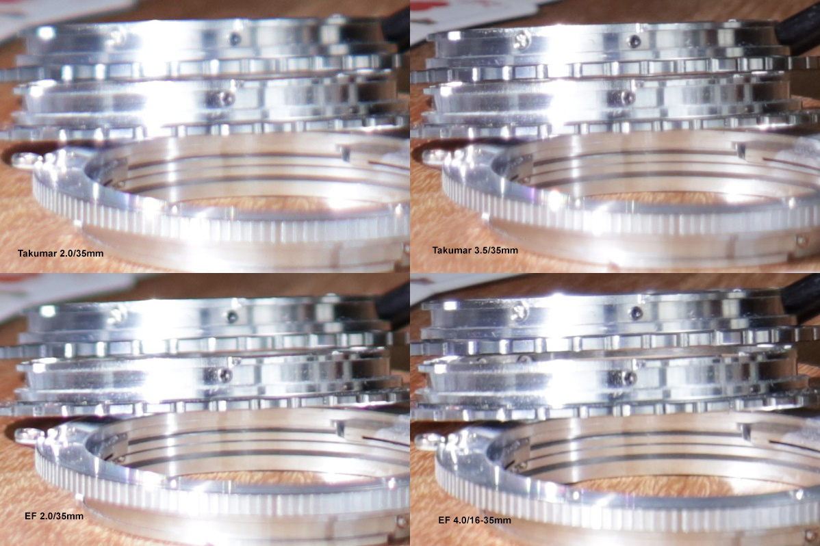 Als Kamera kam wieder die Canon EOS 5Dsr zum Einsatz. Bildstil neutral, alle Bilder direkt aus der Kamera ohne EBV. Verkleinerung für das Forum mit IrfanView (Lanczos3). Alle Objektive wurden auf F/2.8 eingestellt oder auf Offenblende, wenn sie langsamer als F/2.8 sind. Es wurde von einem stabilen Stativ mit Spiegelvorauslösung und Kabelfernauslöser fotografiert. Als Beleuchtung diente neben dem stabilen Standardgrau des Siegerländer Himmels der letzten Tage auch noch ein Blitz von rechts-oben-vorn und ein Blitzspot auf einige Metallgegenstände. Die Belichtungszeit bei allen Aufnahmen war 1/25s. Bei F/2.8 wurde mit ISO 200 gearbeitet, bei kleineren Blenden mit entsprechend höherem ISO. Ja, eine Reihe mit F/2.0 und ISO 100 habe ich bei der Gelegenheit auch angefertigt...