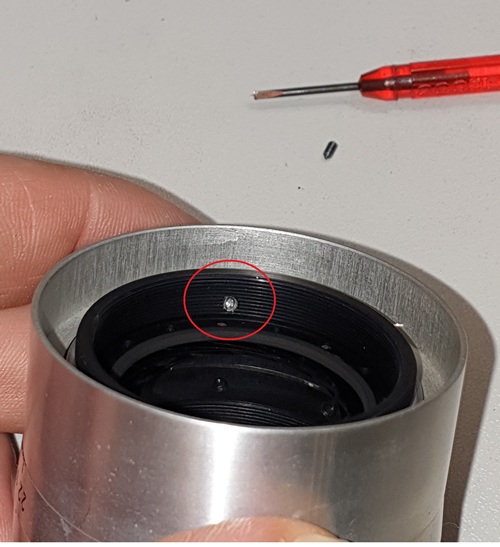 An der Blende auf der Rückseite sitzt eine kleine Madensschraube M1,7 mit Spitze, welche den Blendenkorpus mit dem hinteren breiten Ring klemmt, so dass dieser nicht abgedreht werden kann.