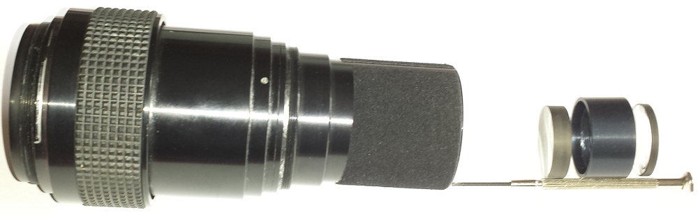 Den M65 Helicoid inkl 62,5 mm Aufnahme hatte ich schon für andere Projektionsobjektive. Dann habe ich mir aus dem Teichbedarf ein 63mm Rohr gekauft, auf der einen Seite so viel abgefeilt, bis es nur noch 62,5mm waren (Sieht leider etwas unordentlich aus). Das Objektiv nimmt in der Breite zu. es gibt eine Stelle, die fast genau in den Innenraum des Rohrs passt. Daher habe ich das Rohr am Eingang mit etwas schwarzem matten Klebeband ausgeklebt, so dass es genau passte. Wegen des Gewichst des Objektivs reichte eine einfache Fixierung durch das einpressen an einer Stelle allerdings nicht. So habe ich 4 Löcher etwas weiter hinten in das Rohr gebohrt, von innen 4 kleine Muttern gesetzt und halte das Objektiv jetzt mit 4 Schrauben jetzt dort noch einmal zentriert fest. Die Schrauben momentan sind leider noch etwas lang. Die 10mm Schrauben waren etwas zu kurz und etwas dazwischen hatte ich gerade nicht - wird aber noch getauscht.