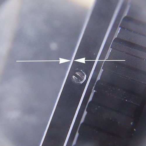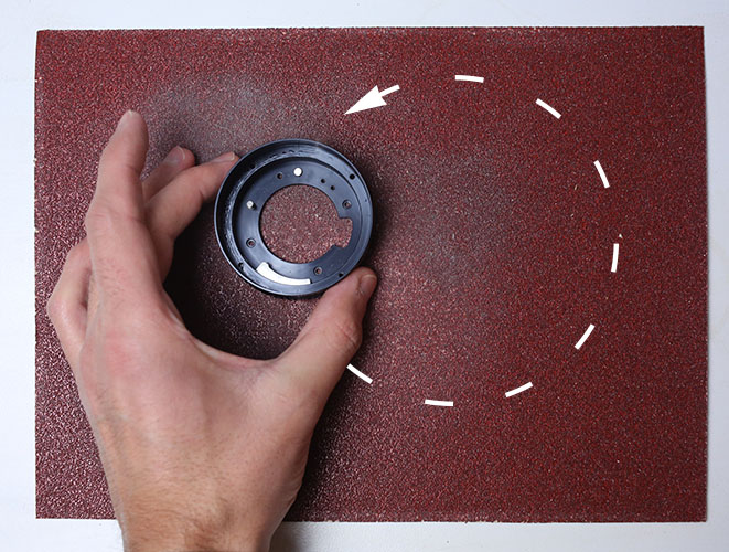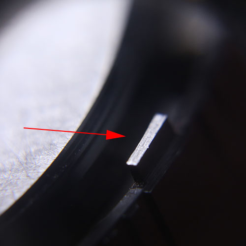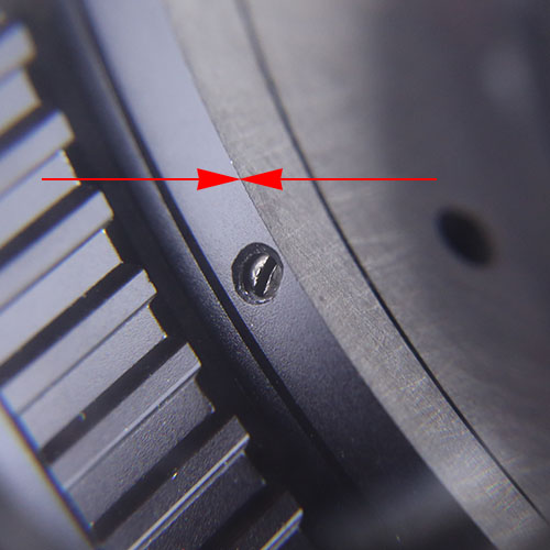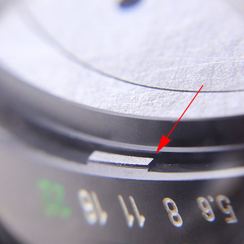 Dazu am Deckel (bitte wieder aufs Objektiv schrauben und vor die Kamera halten) dann mit einem Lackstift oder Edding zunächst einen Punkt- oder Strich machen (bitte dort, wo Du nicht schleifen wirst), damit Du im Anschluss auch am PB Adapter die genaue Position der Skalen mit dem Deckel in Übereinstimmung bringen kannst ! Sehr wichtiger Punkt, sonst hängen die Blenden- Meter-Skalen im schlimmsten Fall 180° abgewandt und wären nicht mehr lesbar.