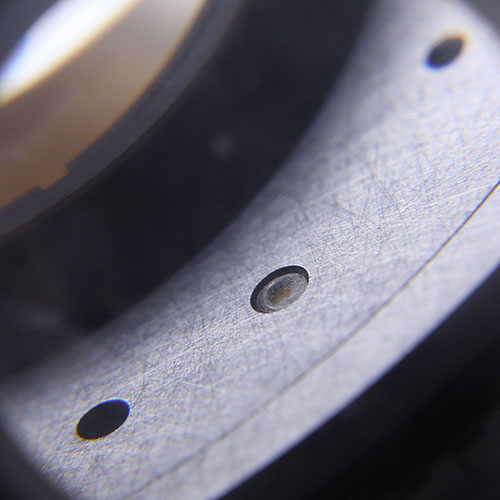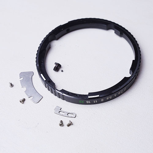 Um die "Übersteher" wegzuschleifen hab ich den Blendenring demontiert. Das ist auch später für das Schleifen der Auflagefläche sinnvoll. Dadurch verläuft sich später kein Metallstaub in den Blendenring. Der Ring ist mit entfernen von 5 schrauben leicht abzubauen. Vier schrauben fixieren zwei Metallscheiben welche die Steuerkurven der Blendenmechanik ansteuern. Die 5. ist seitlich auf dem Blendenring zu finden und sorgt mit einer sehr kleine Metallkugel welche sich auf der Spitze der Schraube befindet dafür, das die Blendeneinheiten einrasten. Diese macht sich ganz schnell selbstständig wenn man etwas unachtsam ist. Hätte sie fast verloren:)