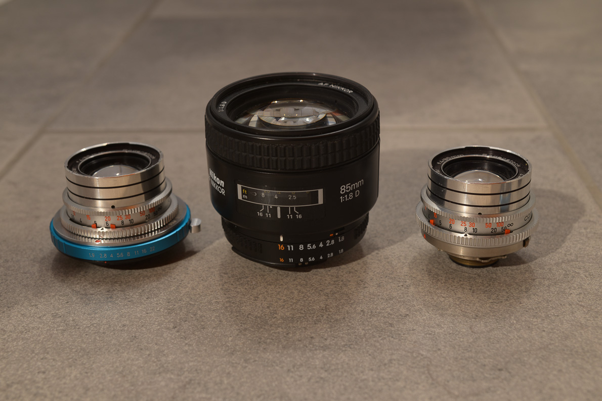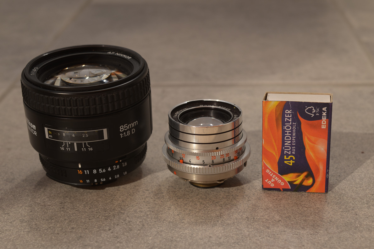 Nochmal ein Größenvergleich mit dem Nikkor 85/1,8 AF-D und dem Rotelar mit und ohne Adapter.