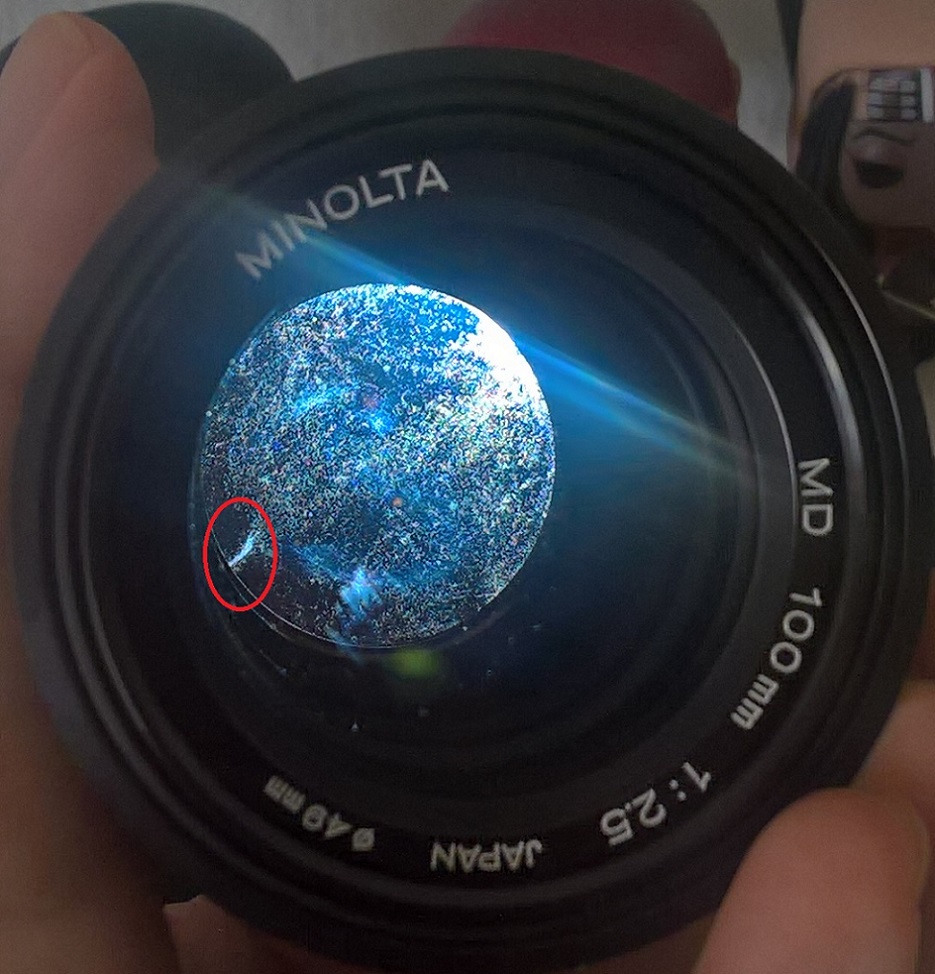 Hier wurmt es mich am meisten, die Optik ist bis auf das Rückelement in neuwertigem Zustand, absolut tadellos, optische Einschränkungen konnte ich noch nicht testen. Aber ich weiß einfach nicht was das seien soll.