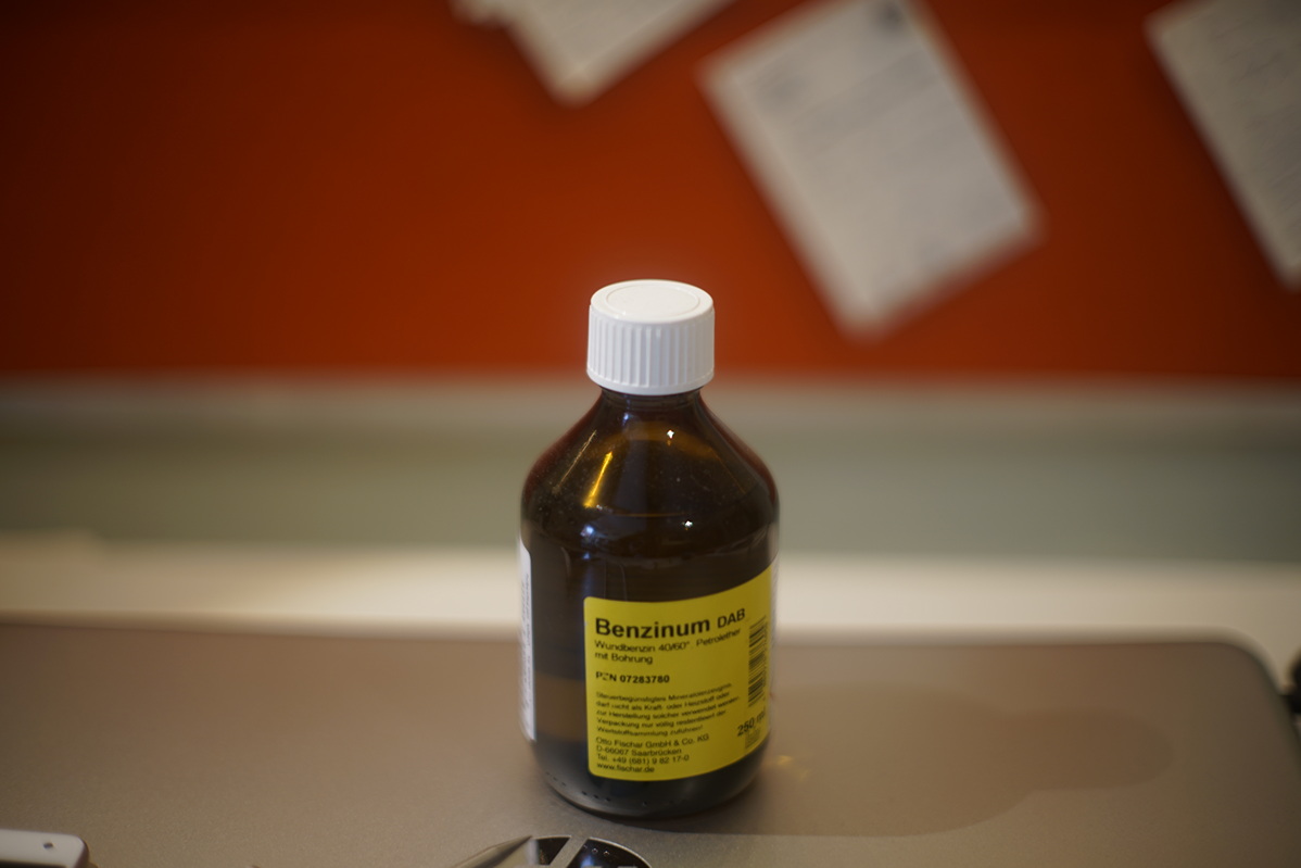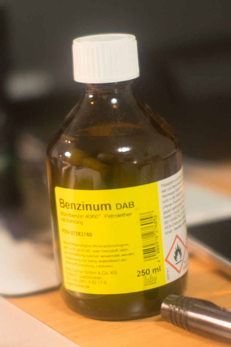 Hier dann noch zwei Testbilder, wieder vom schön hellen Deckel meiner Benzinum-Flasche. Erst vor dem Drehen der Rücklinse, dann danach: