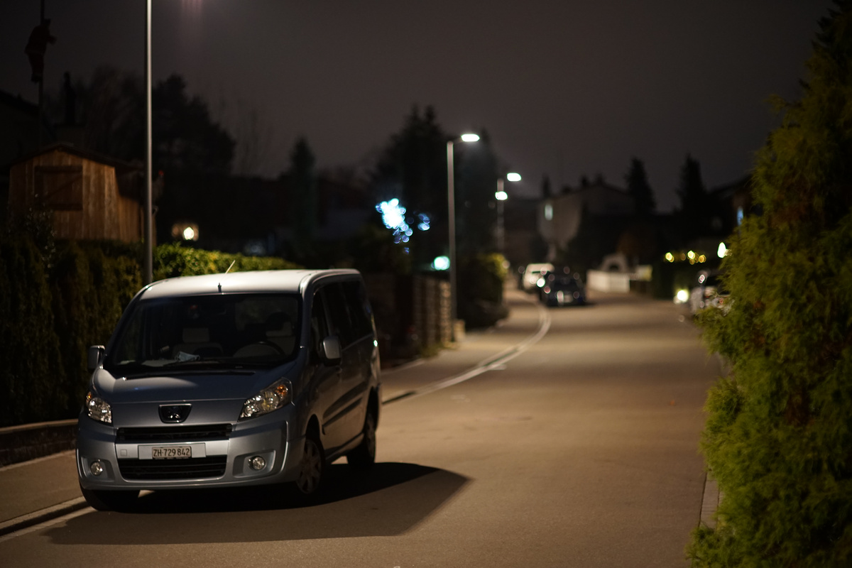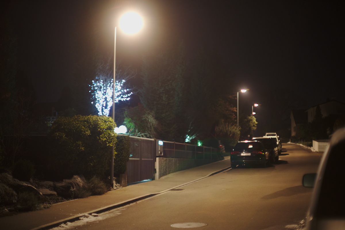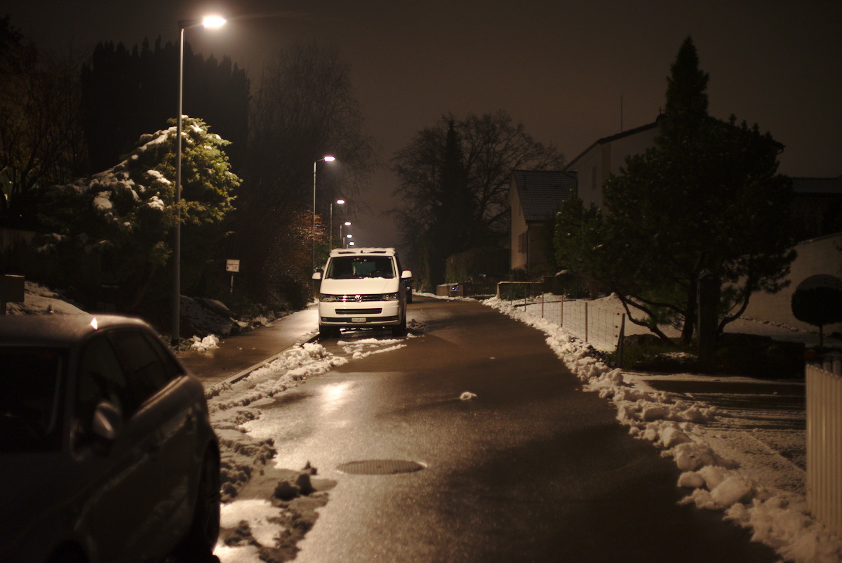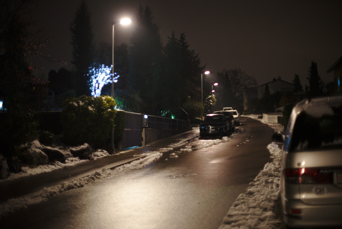 Neue Nacht, neues Glück. Es hat morgens geschneit und den Tag über ist es teilweise wieder weggetaut. Diesmal Canon Lens FD 55mm 1:1.2 S.S.C. Aspherical und Nikon Nikkor AI 50mm 1.2 (7 Blendenlamellen). Immer zuerst das Canon, dann das Nikon. Offenblende bei ISO 1600 aus der Hand an der Sony A7 II mit IBIS, -1 EV und aus Raw in Darktable mit Defaultwerten entwickelt. Neben der grösseren Brennweite fällt das Canon durch einen leicht gelblichen Farbstich auf und manchmal eben Zwiebelringe.