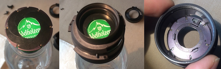 Zum Entfernen des vorderen Glaselements muss man zuerst den Namensring herausschrauben. Dann hab ich etwas vorschnell den untersten Ring auch noch herausgeschraubt ( siehe drittes Foto unten, halte ich in der Hand), denn dann haben