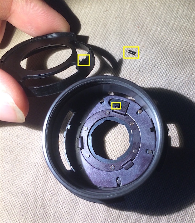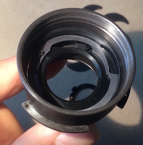 um an den Zoomtubus ranzukommen muss man den inneren Blendenmechanismus herausschrauben, unten abgebildet, das ganze Teil..( drei verschiedene kleine Schräubchen), hier noch total verklebt.