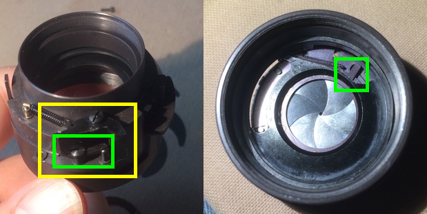 der Hebel (gelb) übersetzt ja nur den unteren (grün), und dieser schiebt ja( innerhalb seines kleinen Hubs) im Inneren des Tubus den Blendenring. Der Metallring darüber macht ja dann die prinzipielle BlendenÜBERSETZUNG ( er hat ja ne Kurve, Bild unten).