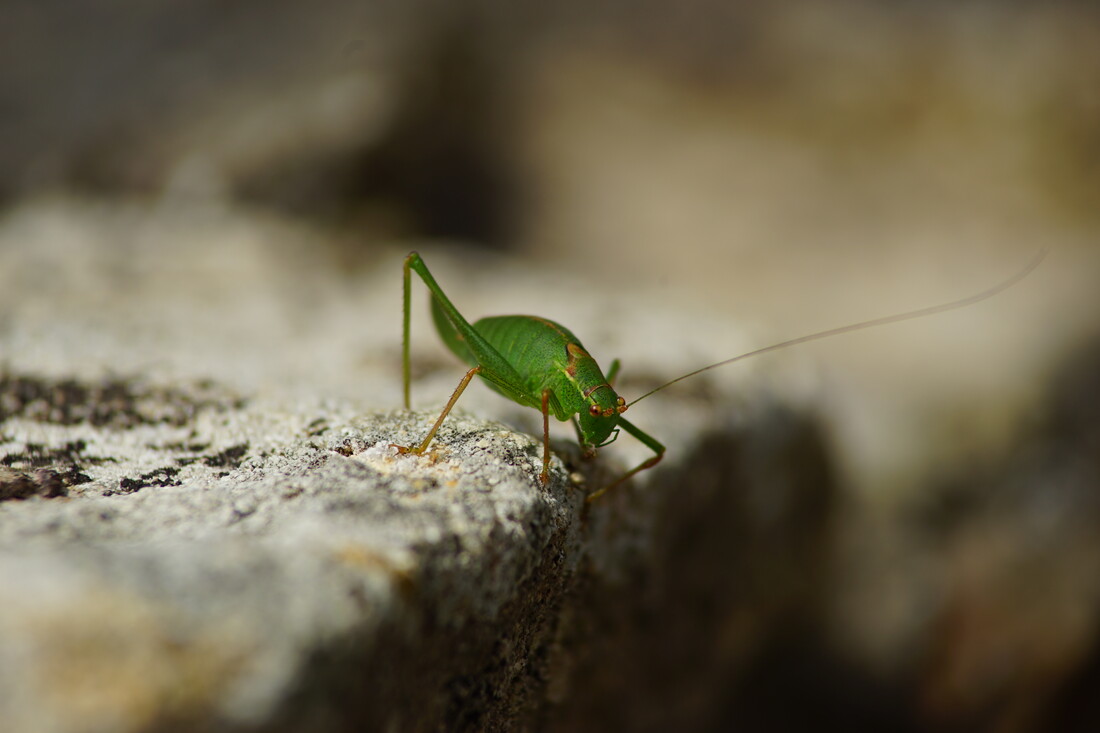 Grüne Heuschrecke, vielleicht Punktierte Zartschrecke (Leptophyes punctatissima) ca. 1,5 cm groß, 200mm f5.6 1/160s ISO100, zwei Zwischenringe (insgesamt 26mm), JPG aus der Kamera (Sony A7II), nur verkleinert