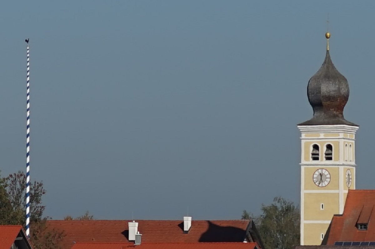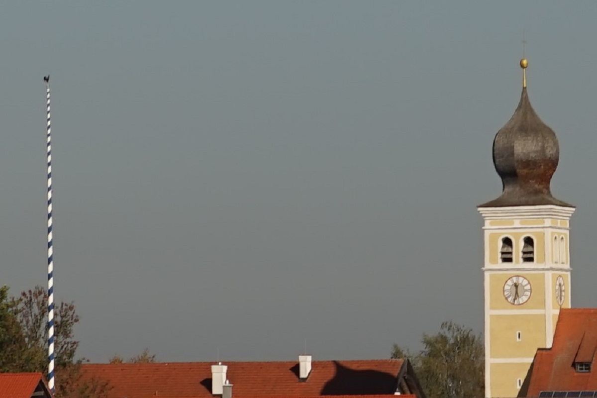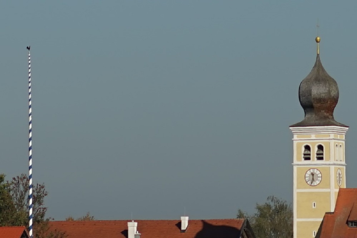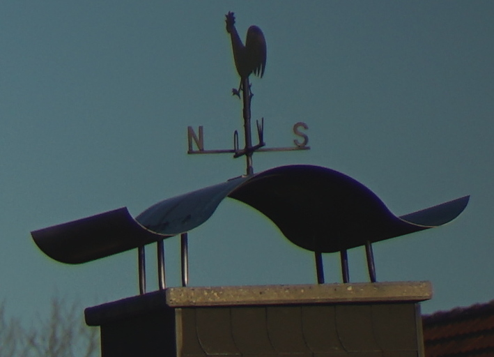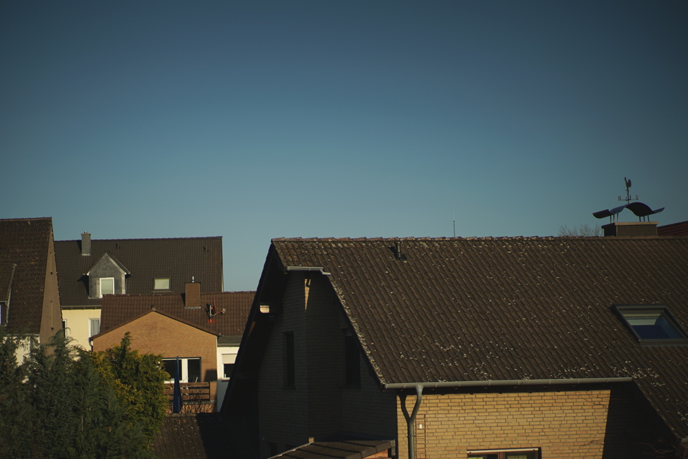 Hier eine Totale, manuell fokussiert auf den Kamin mit Wetterhahn. Die Vignettierung lässt ahnen, was die Stunde geschlagen hat. Worst Case volle Öffnung f2: