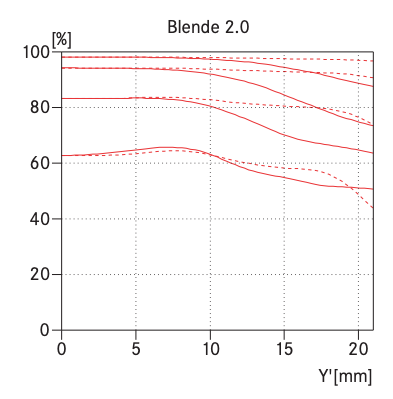 Das Objektiv, wie gesagt, ist über 50 Jahre alt. Inzwischen liegt es als APO-ASPH-Typ vor, und laut aktuellem Sheet ist bei Blende f2 im Randbereich keineswegs alles in Butter. Die 40-lp/mm-Kurve kontrastiert auch hier nur mit schwachen 50%: