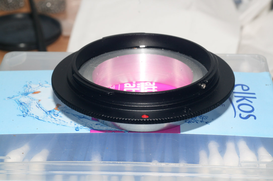 Oder im rechten Bildteil direkt in einem M42 > Canon EF Adapter eingepasst und durchgeschraubt.
