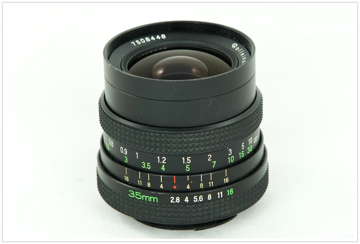 Jedenfalls mußte das Mamiya-Zulieferteil hausintern mit dem Zeiss Distagon 2,8/35 konkurrieren. Das Rolleinar wurde von Mamiya in Japan gebaut. Wie es zu einer geringen Anzahl "Made in Singapore" kam, ist mir bislang unbekannt. Es gab nebenbeibemerkt auch das Rolleinar 1,4/55 "Made in Germany" und das Rolleinar 2,8/135 "Made in Singapore" als weitere Ausnahmen von der Regel, daß alle QBM-Rolleinare aus Japan kommen.