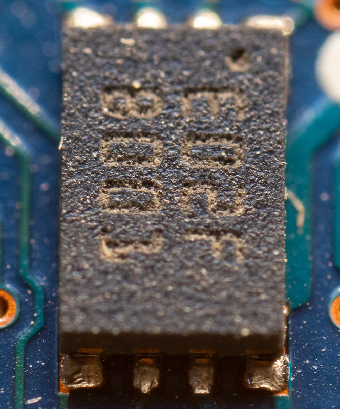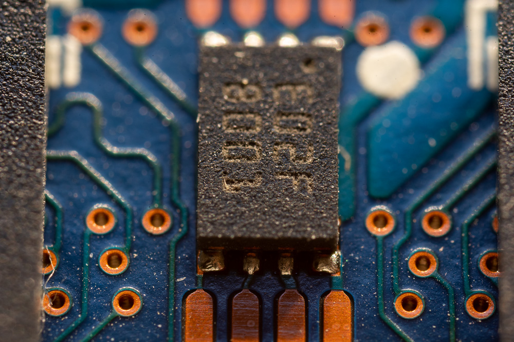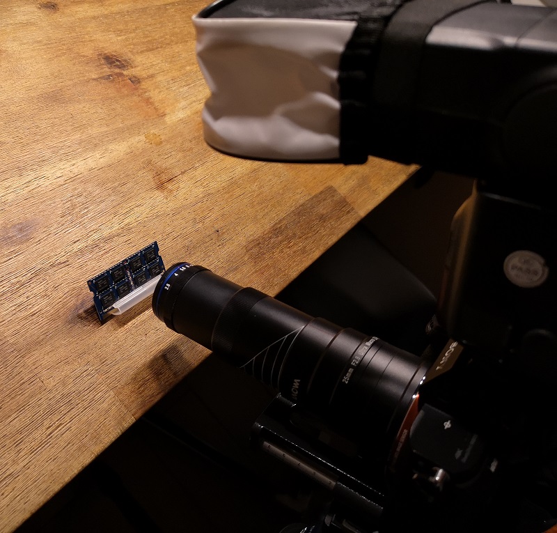 A7R2 auf Makroschlitten zum fokussieren und manuellem Blitz mit Diffusor. Der eingekreiste Chip sollte im Fokus sein, soweit wie möglich und die Arbeitsblende war 5.6.