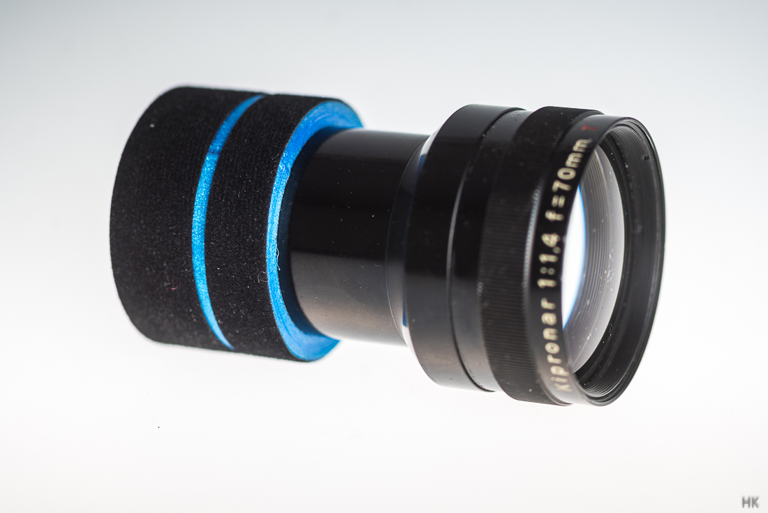 Um es fokussierbar an eine Kamera zu bringen, bietet sich wie bei den meisten Projektionsobjektiven Henrys genialer Samtfokussiertubus an. Allerdings braucht man dafür in diesem Fall einen 5mm dicken Adapterring, um den Standard 52,5mm-Tubus nutzen zu können. Ich habe mir ein solches Teil kurzerhand aus elastischem PU-Material 3D-gedruckt:
