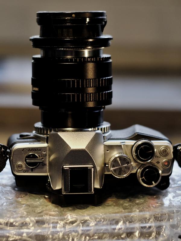 So sieht die Kamera aus, das Objektiv steckt größtenteils im Helicoid, sieht fast grazil aus an dieser "wuchtigen" Kamera