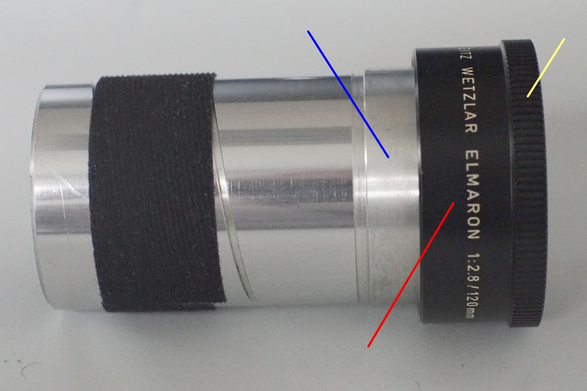 ROT und GELB zusammen sind "der Hut", BLAU ist beim Elmaron die Tubus Verdickung, die sich nicht in das 42.5 Gewinde des SFT versenken lässt ... weshalb ein verlängerter vorderer Tubus beim 42.5 SFT sinnvoll wäre.