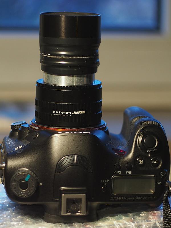 Mit der aufgeschraubten Blende, Distanzringe an der Kamera, SFT 52,5, SFT 42,5 in Retrostellung, 2 bis 3 Filterrahmen 55 Durchmesser, Irisblende mit Aufsatzstück Durchmesser 55