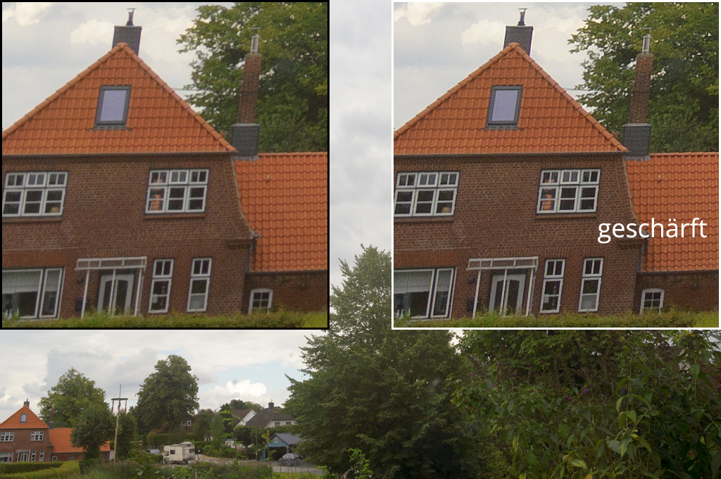 Ich habe ein paar ältere Tokina-Aufnahmen gefunden, die zeigen aber keine Eckschärfe, also habe ich heute mal schnell die 2. Version an eine Nex-5N gepackt, um das zu zeigen (durch's immer noch dreckige Fenster, also keine Idealbedingungen). Durch den Crop-Faktor hat man hier also etwa ein 25mm-Weitwinkel in Vollformat-/Kleinbild-Äquivalenz. Aufgenommen mit Blende 11. Wenn auch erste, leichte Beugungsunschärfen in der Bildmitte auftreten, finde ich das Ergebnis bis in die Ecken im Vergleich zur Leistung am Vollformat erstaunlich gut. In Lightroom reichte die automatische Korrektur der bei diesem Objektiv heftig auftretenden CAs, außerdem habe ich die Tonwertkurve/Kontraste angepasst und vor dem Export eine Schärfe 100 (ohne Details) gewählt. Im umrahmten Kasten ist der 1:1-Crop der linken Bildecke zu sehen. Da die Schärfe in Lightroom moderat war, ließe sich das noch verbessern, zeige ich im weiss umrandeten Crop: Photoshop/Unschärfe Maske. Gut genug also, um damit gelegentlich ausreichend scharfe Weitwinkel-Lanschaftsaufnahmen am APS-C-Sensor zu machen.