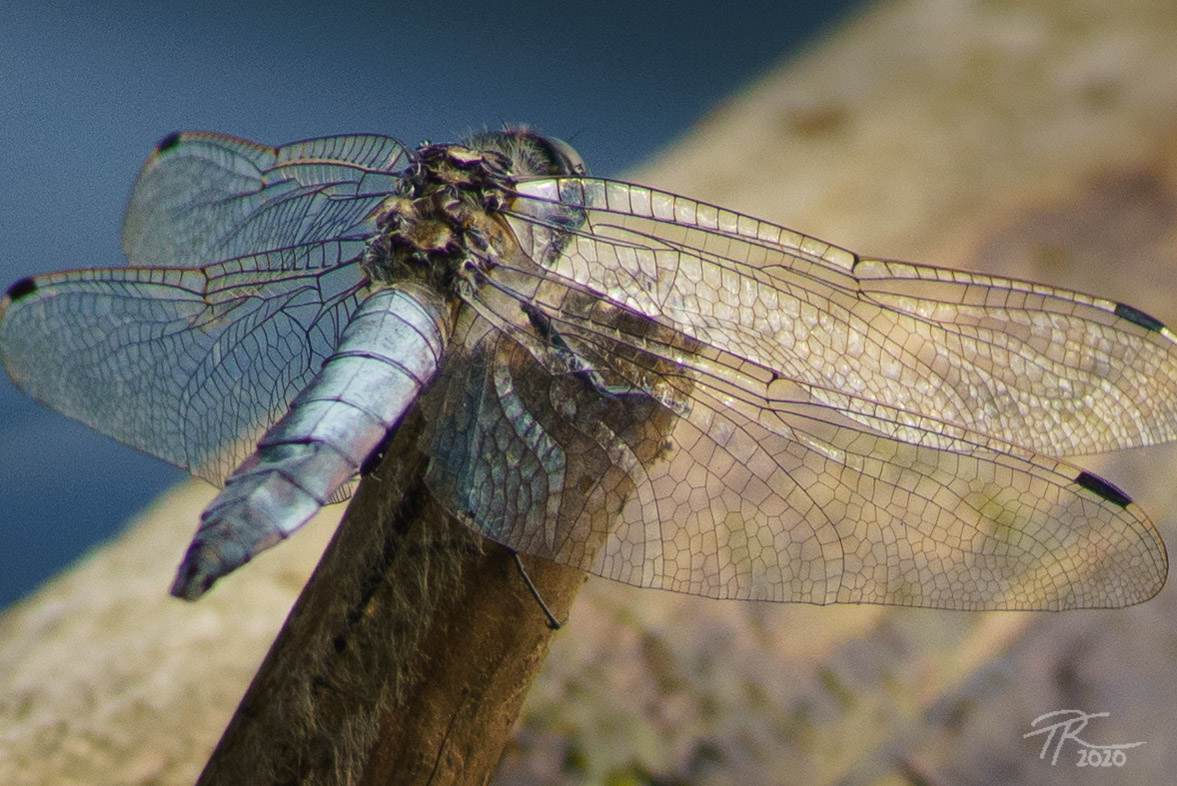 Ich war gestern auf Libellen-Jagd. Die Biester mit einem manuellen Zoom bei 300mm im Flug zu erwischen ist nicht so einfach. Zum Glück sind sie scheinbar gestern an mir interessiert gewesen und blieben ab und zu ein paar wenige Sekunden in der Nähe in der Luft stehen. Nachdem ich mich derart, nebenbei etwa 2 Stunden von den Mücken buchstäblich habe fressen lassen, habe ich ein paar brauchbare Bilder bekommen. Meine vorangegangenen Versuche mit dem (von der Brennweite viel kürzeren AF-Objektiv) Sony 1.8/85 waren dagegen viel erfolgloser. Die Bilder sind nach Gusto bearbeitet.