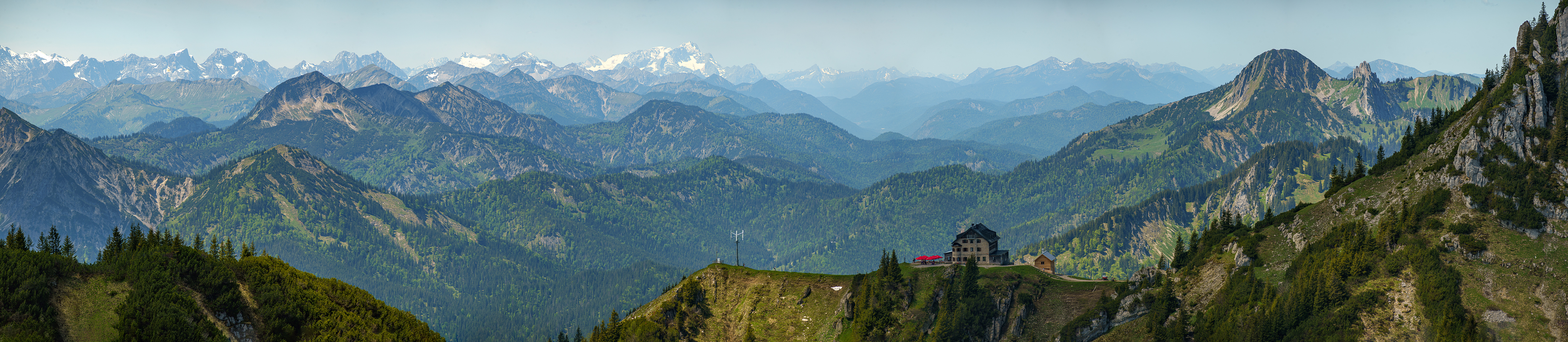 Pano, Original mit ca. 38.800 px Breite, hier für's Forum auf 6000px reduziert. Im Vordergrund: Das Rotwandhaus, Mittelgrund rechts: Der Risserkogel und der Kletter-"Zahn" Plankenstein (oder Blankenstein), hinten Mitte: Zugspitze.