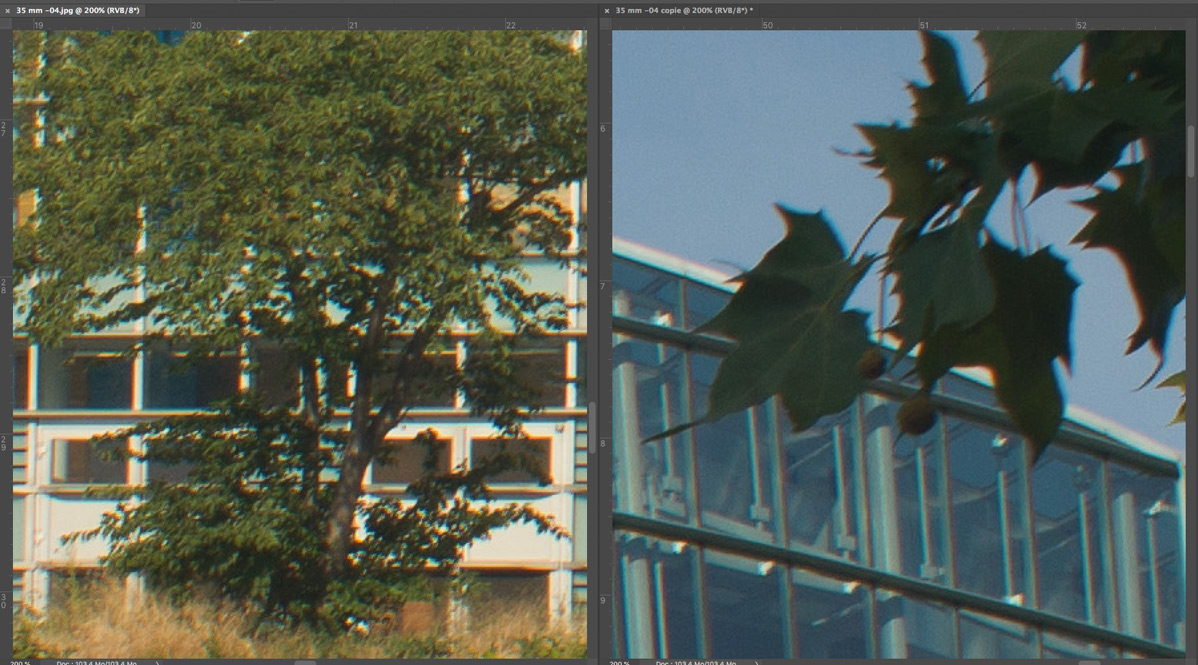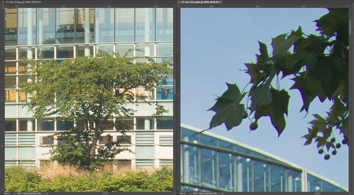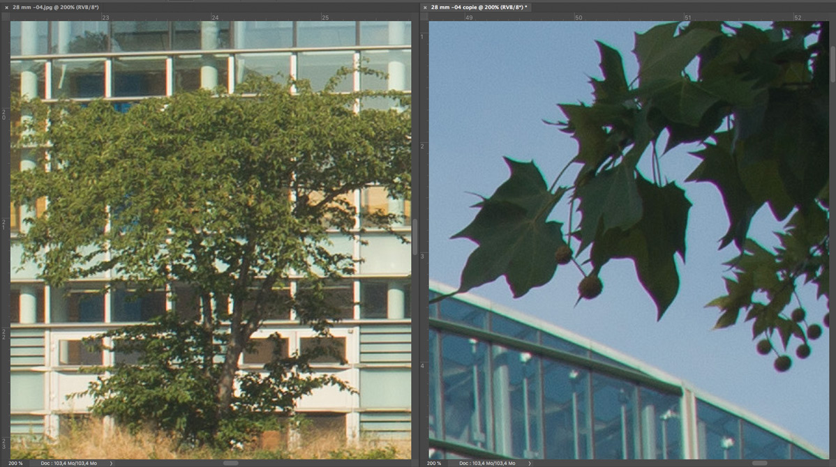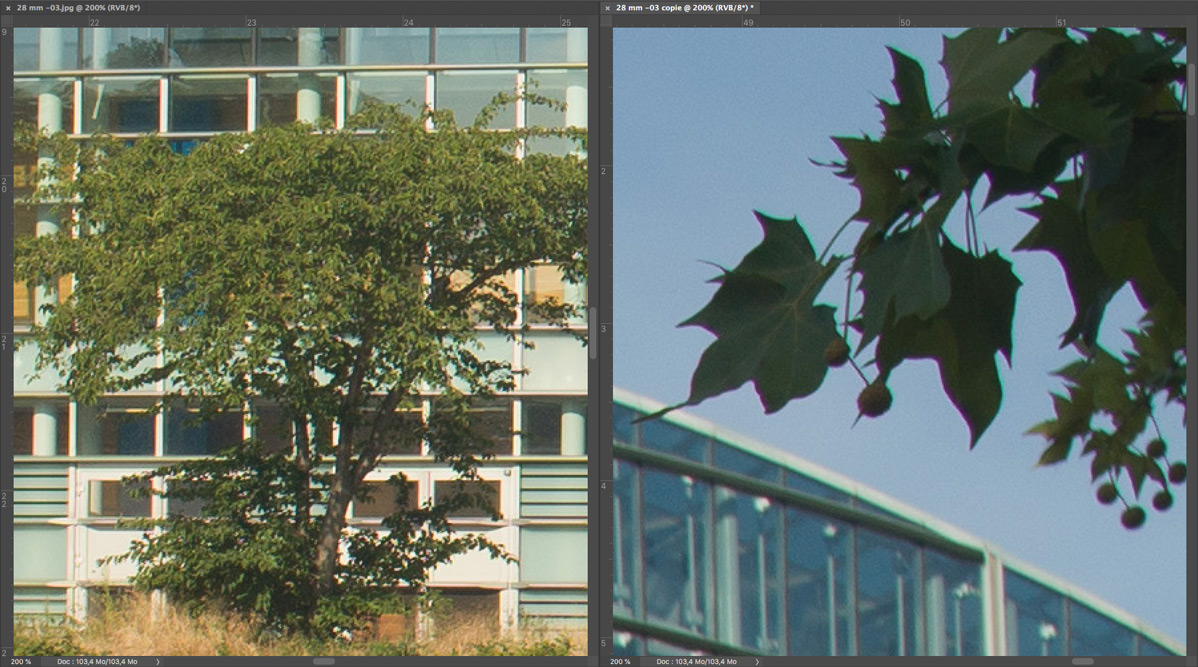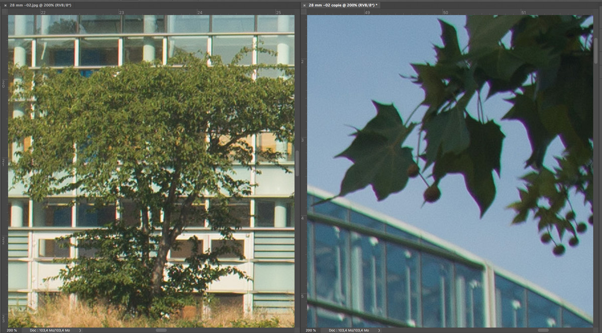Nachfolgend eine Testserie bei Unendlich, mit der Sony A7R nebst Stativ und 2 s Selbstauslöservorlauf bei 100 ISO fotografiert. Es wurde mit maximaler Lupenvergrösserung auf die Glasfassade des Europaparlaments in Strassburg scharfgestellt. Die Bilder wurden nur mit Standardeinstellung in Camera Raw geschärft, die lateralen chromatischen Aberrationen bleiben unkorrigiert. Letztere sind aber in Camera Raw noch gut beherrschbar. Nach der automatischen Korrektion verschwinden sie fast vollständig. Das Foto bei Offenblende und f = 28 mm ist allerdings durch Stativbewegung unbrauchbar geworden. Ich habe es deshalb entfernt. Wie immer handelt es sich um 200%-Ausschnitte, um auch kleinere Unterschiede trotz der hier gültigen Beschränkungen (1198 px. und 300 kb) deutlich zu machen.