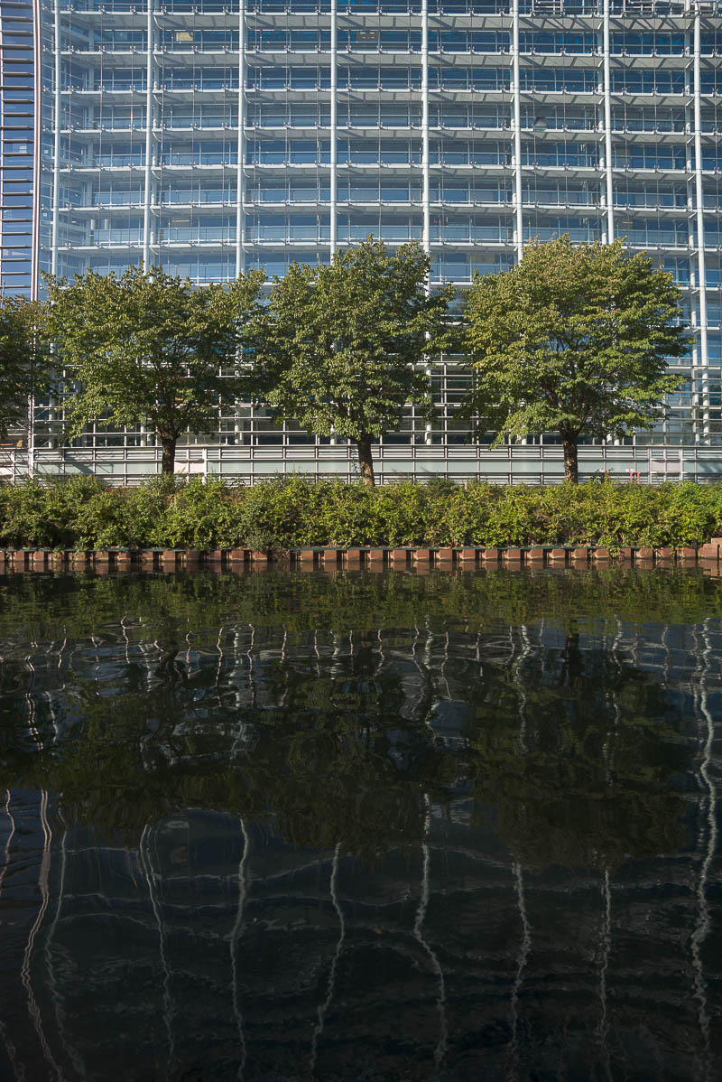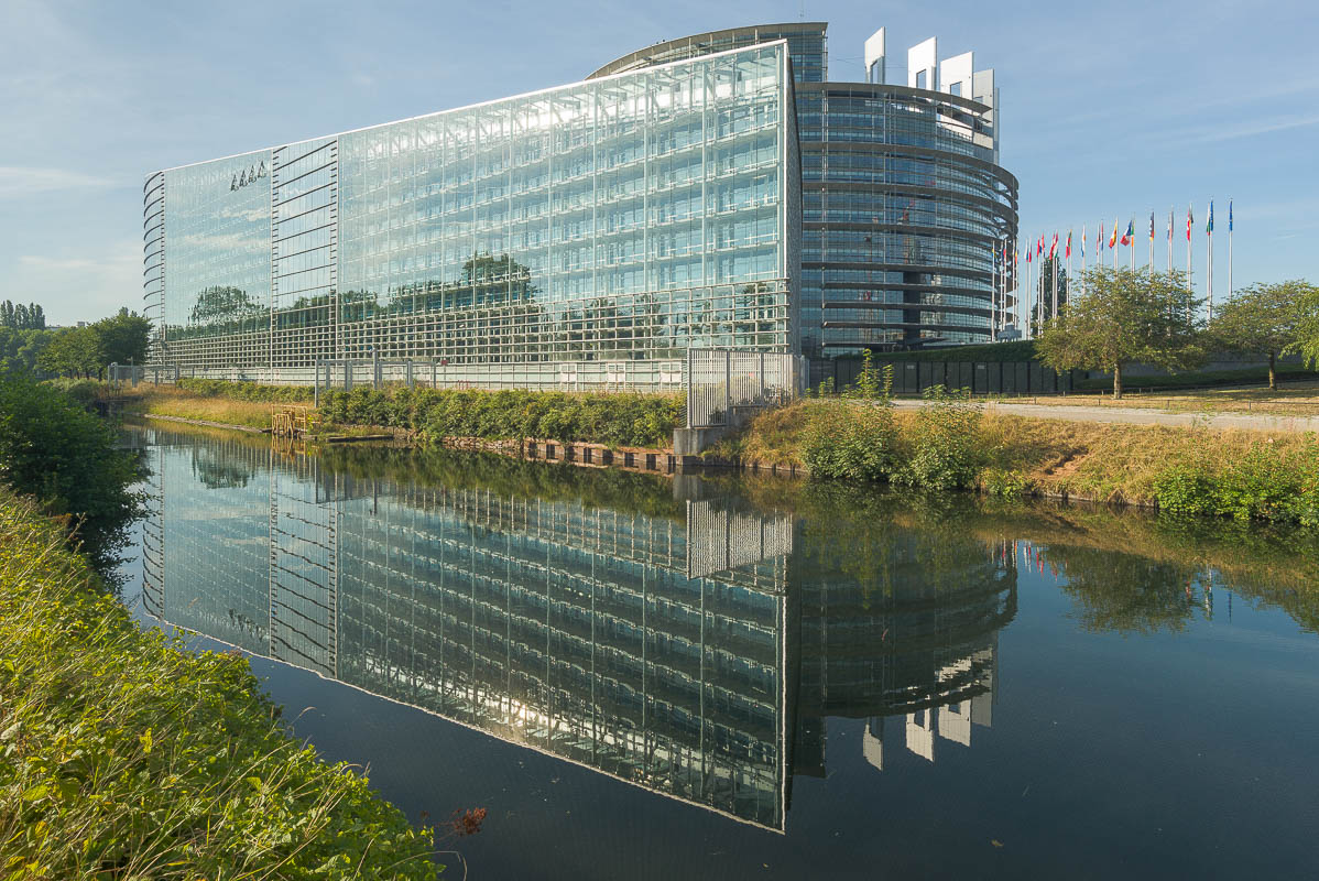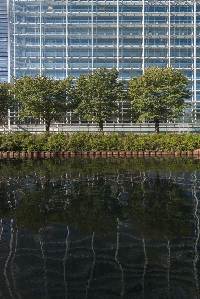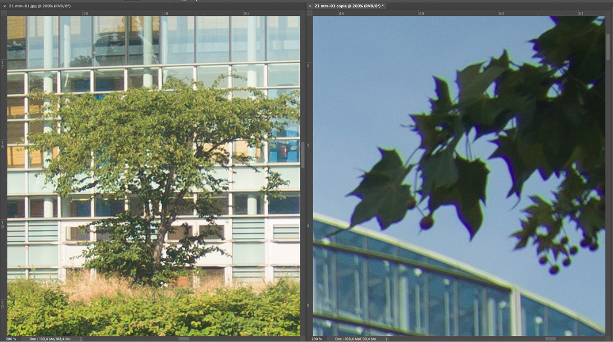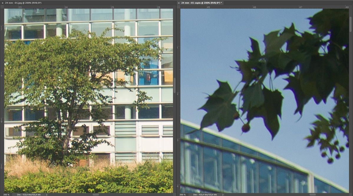Nachfolgend eine Testserie bei Unendlich, mit der Sony A7R nebst Stativ und 2 s Selbstauslöservorlauf bei 100 ISO fotografiert. Es wurde mit maximaler Lupenvergrösserung auf die Glasfassade des Europaparlaments in Strassburg scharfgestellt. Die Bilder wurden nur mit Standardeinstellung in Camera Raw geschärft, die lateralen chromatischen Aberrationen bleiben unkorrigiert. Letztere sind aber in Camera Raw noch gut beherrschbar. Nach der automatischen Korrektion verschwinden sie fast vollständig. Das Foto bei Offenblende und f = 28 mm ist allerdings durch Stativbewegung unbrauchbar geworden. Ich habe es deshalb entfernt. Wie immer handelt es sich um 200%-Ausschnitte, um auch kleinere Unterschiede trotz der hier gültigen Beschränkungen (1198 px. und 300 kb) deutlich zu machen.