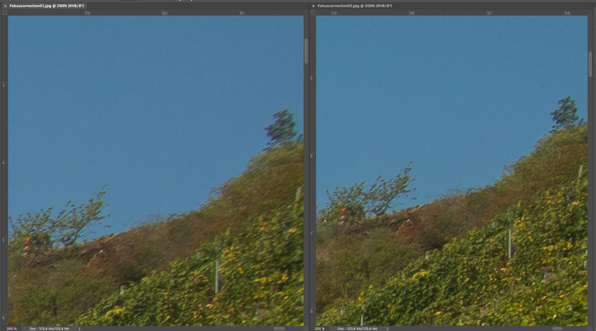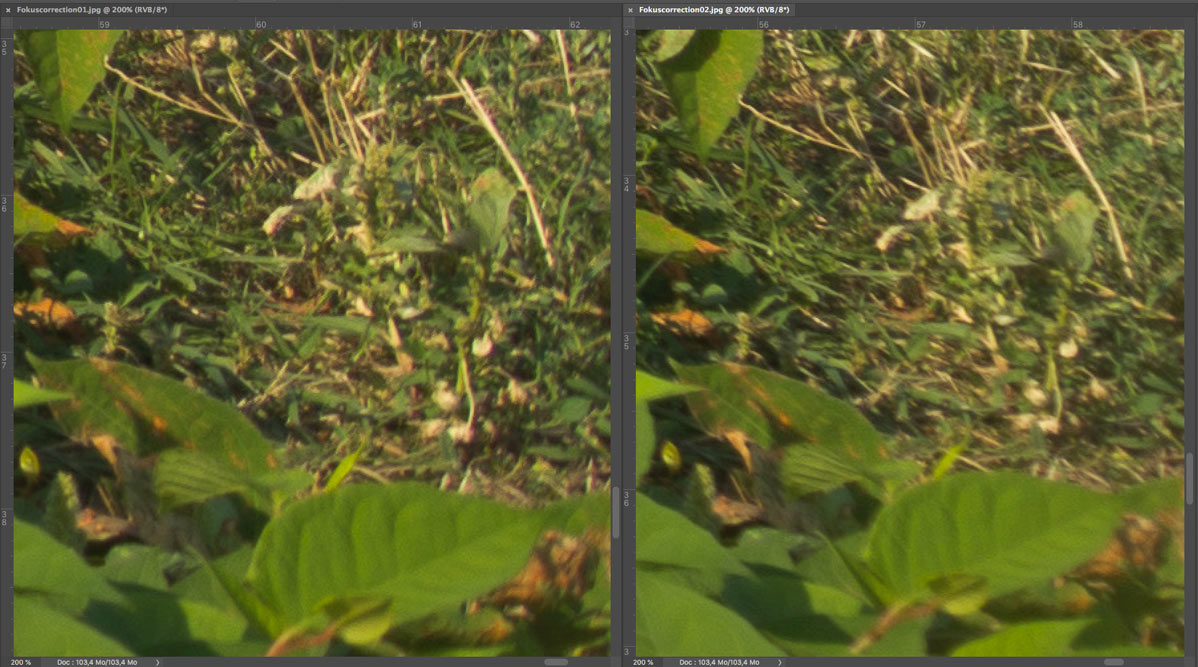 Vergleich zwischen "normaler" und "korrigierter" Scharfeinstellung (rechte untere Ecke, Nahbereich)
