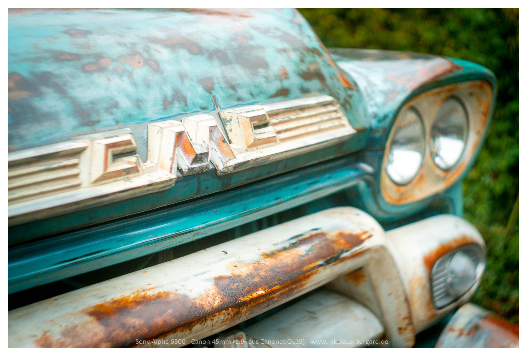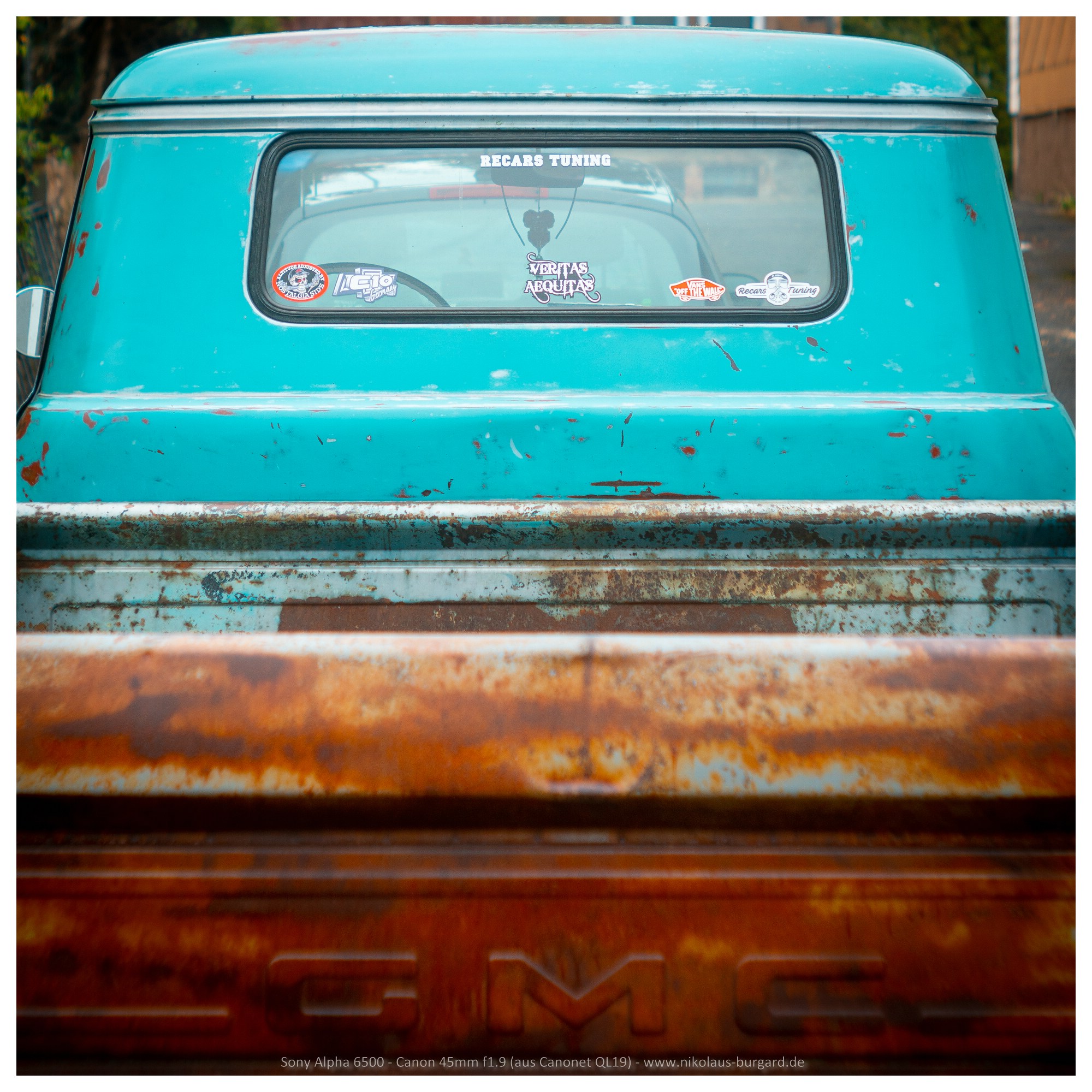 und das Motiv ist der Werkstatt-Truck des Inhabers, ein GMC-"Patina"-Truck aus den 50ern -