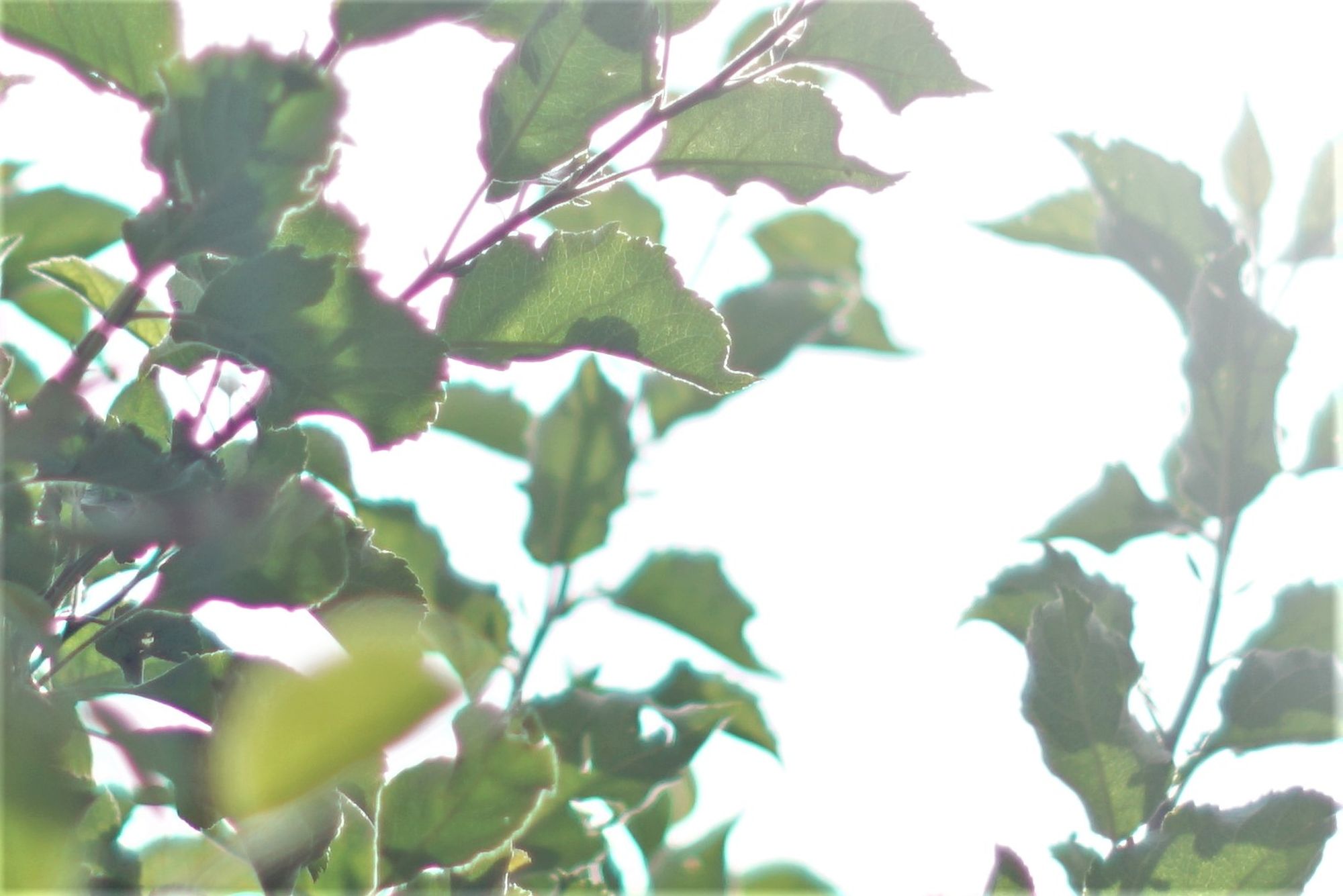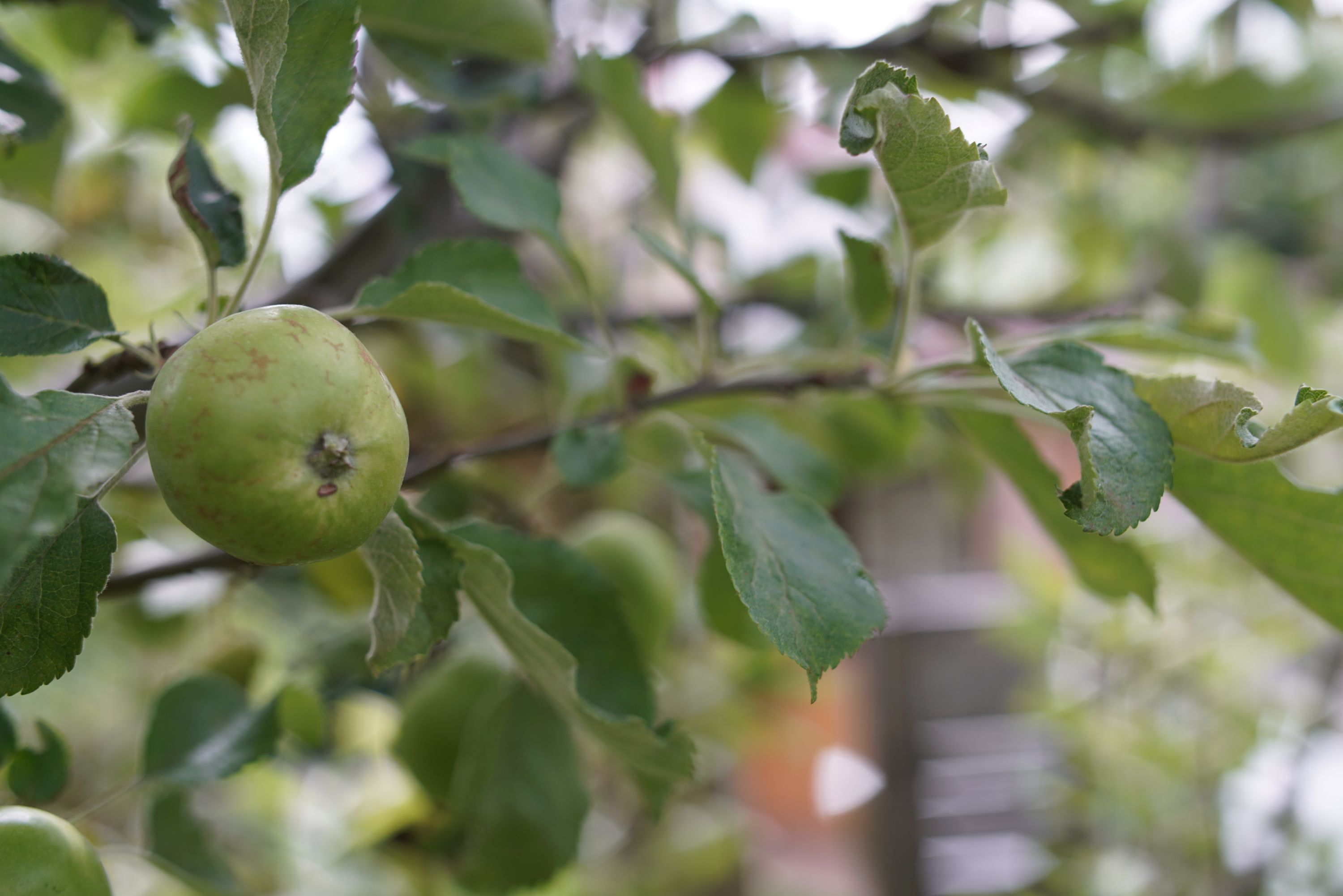 Blick in den Garten, der Fokus saß auf den Kirschen (noch grün...).
