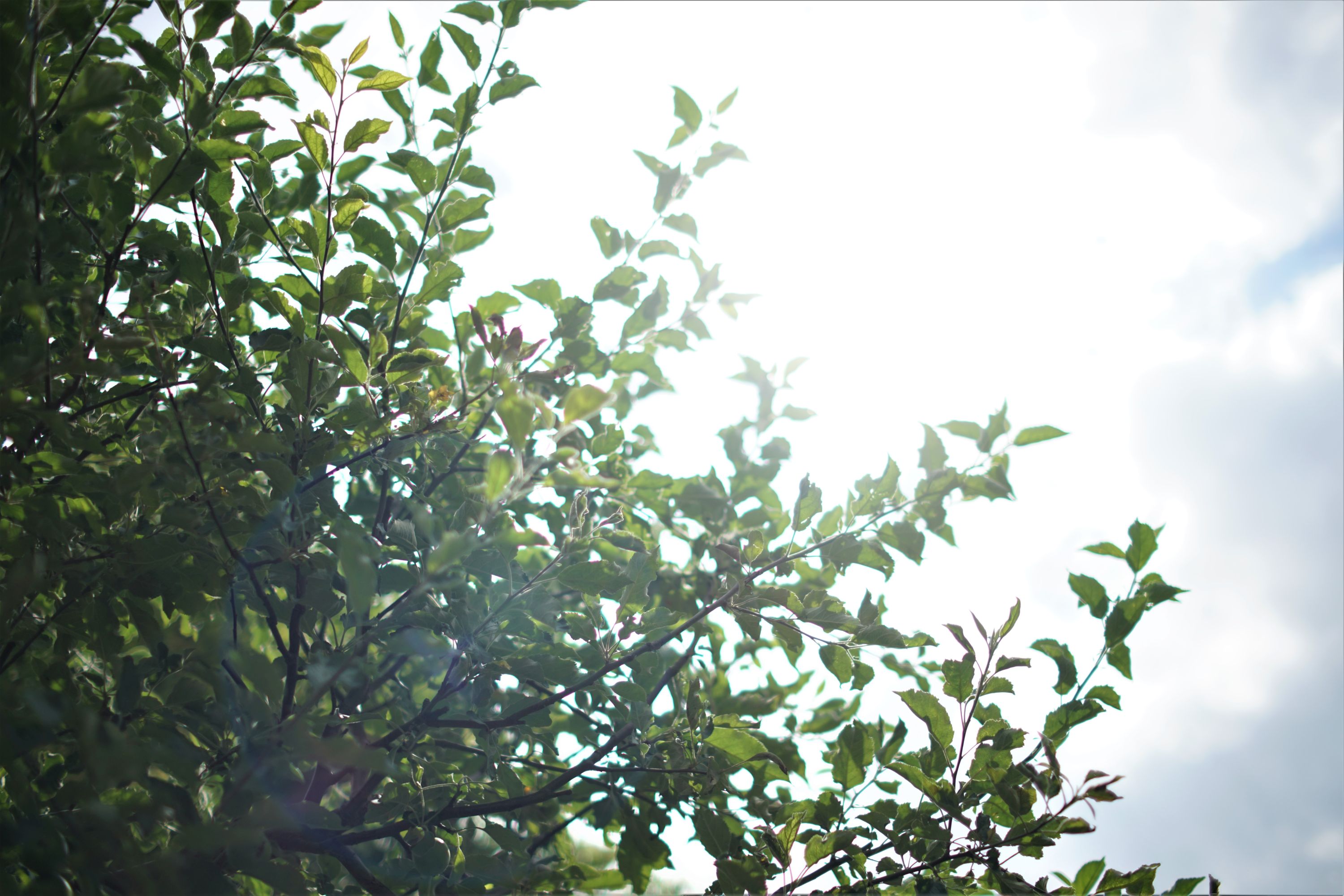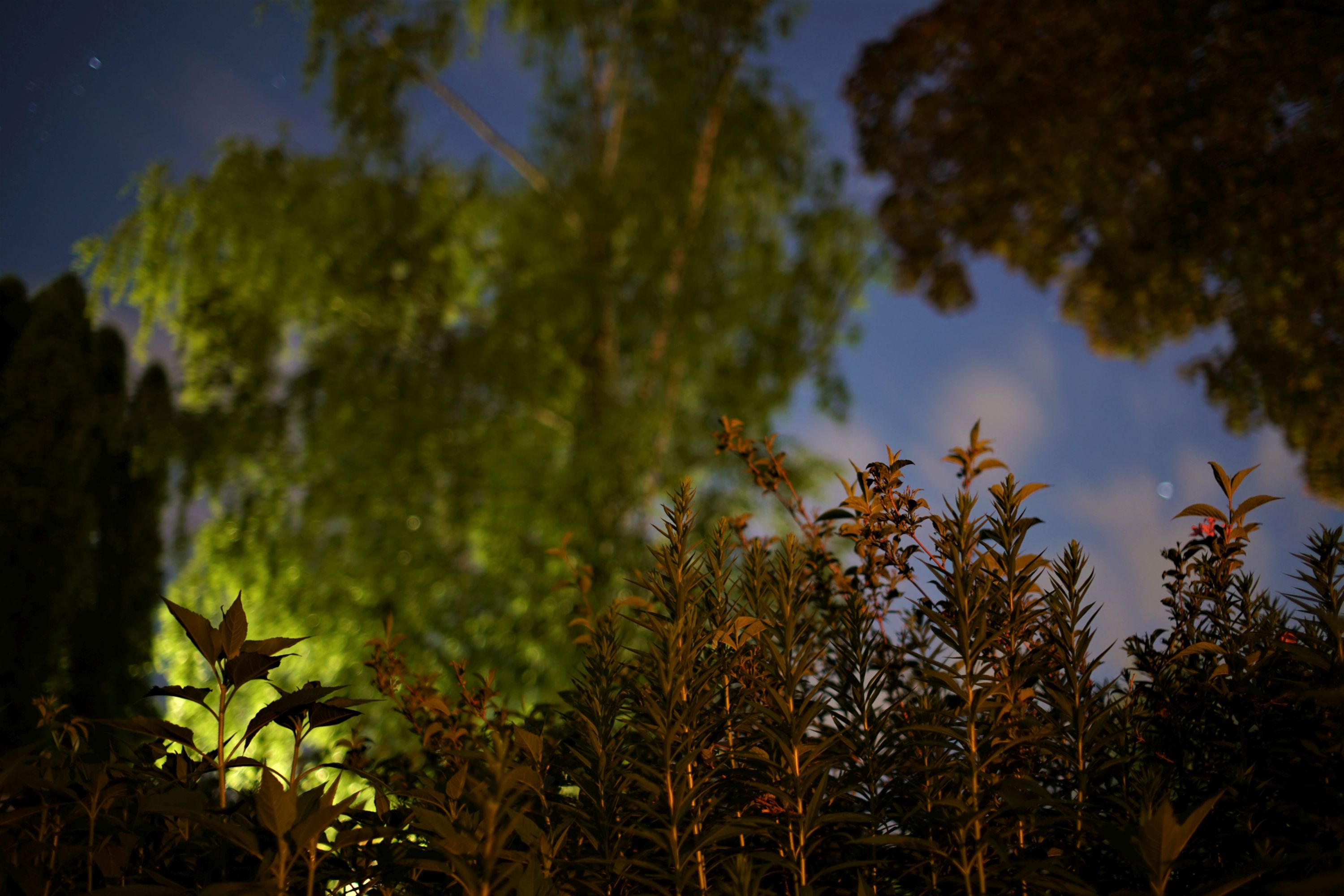 Kirschbaum von unten gegen den Nachthimmel, Fokus auf den Blättern: