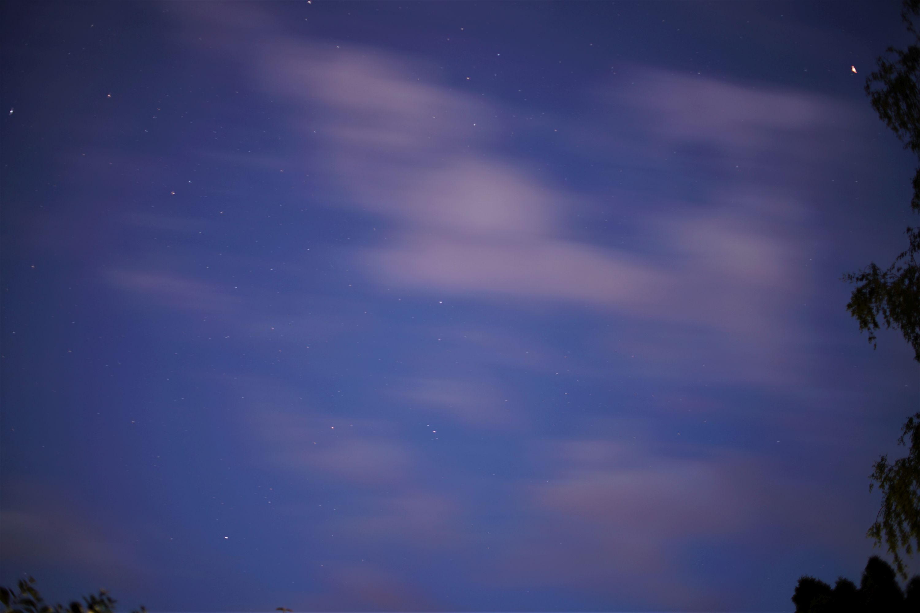 Blick in den Sternenhimmel, mit einigen Wolken und bei noch leichter Rest-Dämmerung: