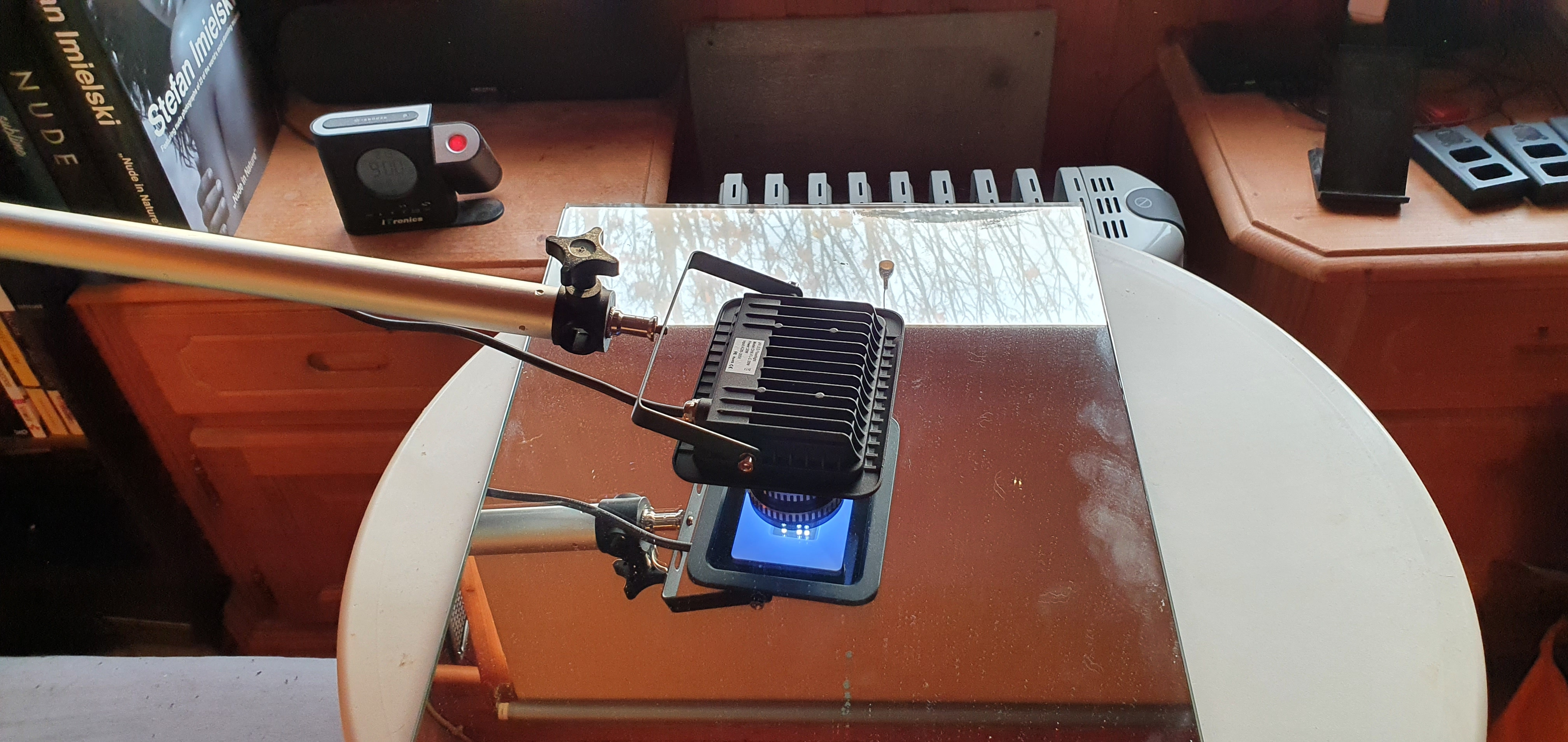 Diesmal bin ich allerdings mit dem Strahler unmittelbar an das Objektiv heran gegangen. Die entstehende Wärme des 50Watt-Strahlers hab ich mit einem 35cm Tisch-Ventilator großräumig vom Objektiv abtransportiert, somit keine Gefahr des Herausschmelzens des Helicoid-Fettes.