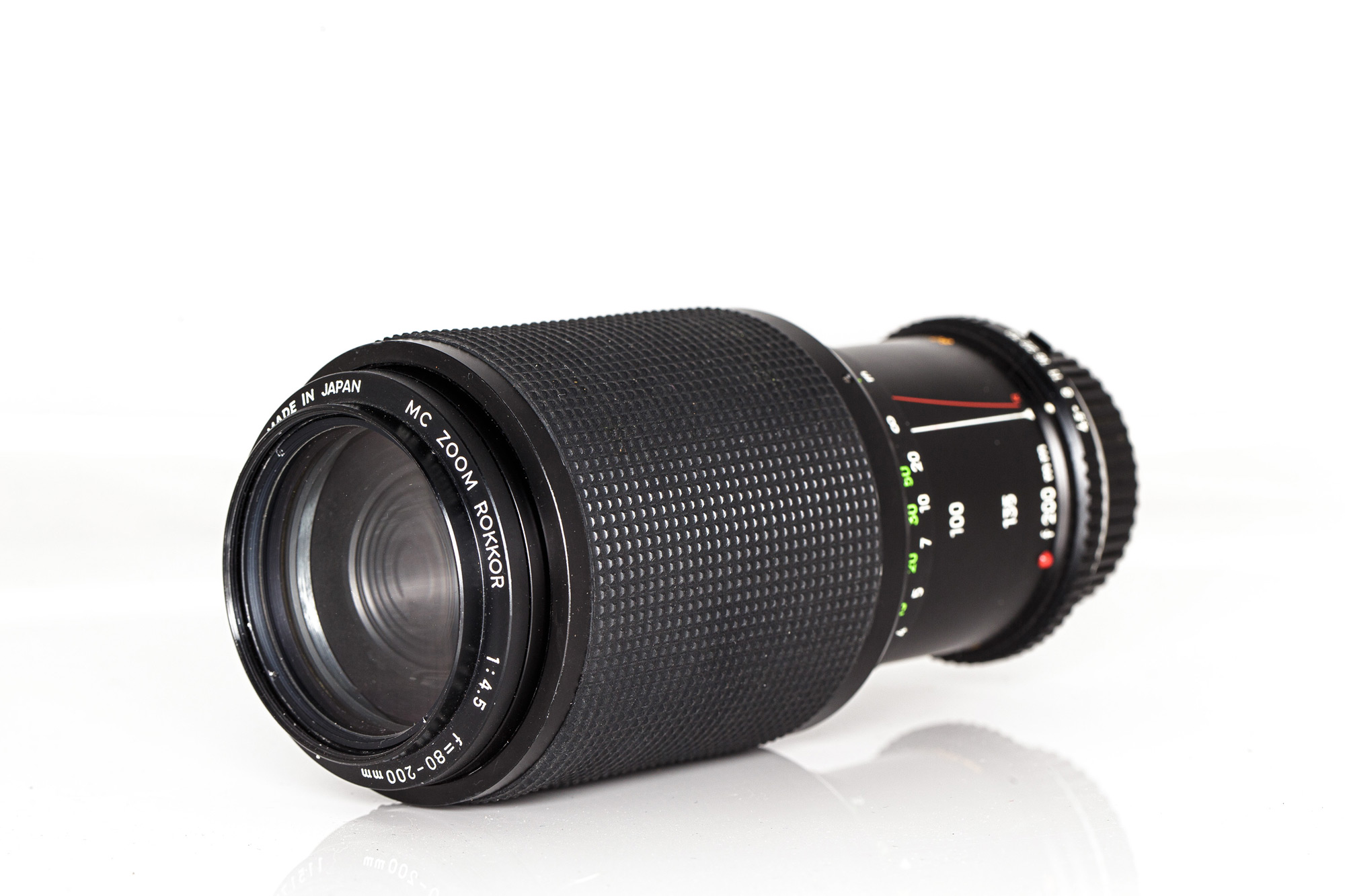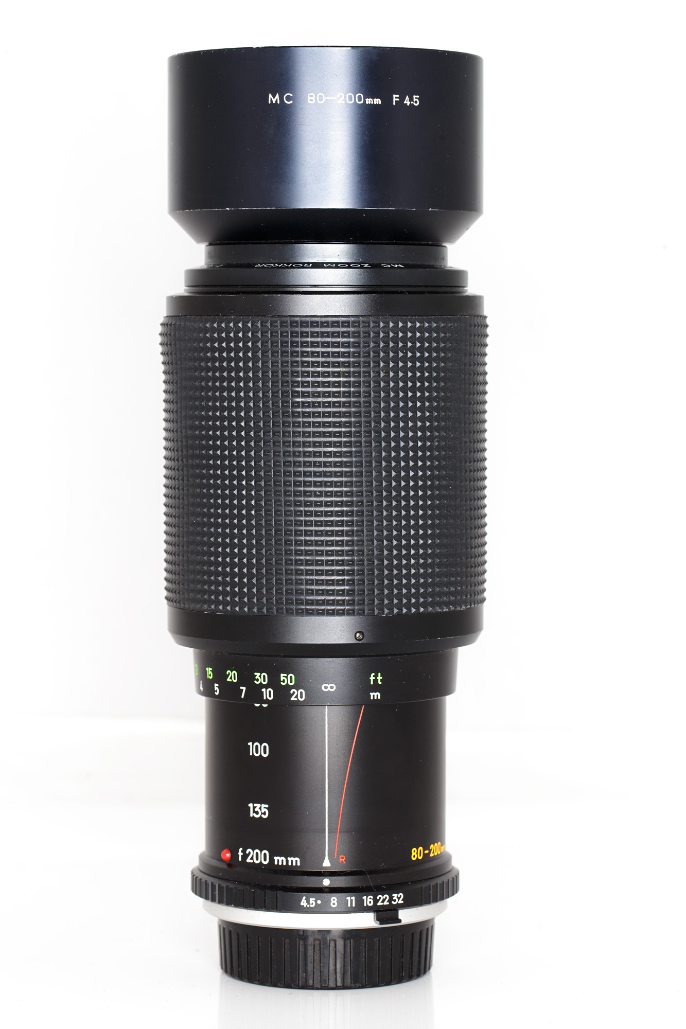 Unter den drei Objektiven ist das MC Rokkor 80-200 mm f/4, 5 wohl eindeutig am seltesten anzutreffen, denn es erschien zu einem Zeitpunkt, als Varioobjektive noch gemeinhin als den Festbrennweiten unterlegen galten und zu stolzen Preisen angeboten wurden. Die Konstruktion ist vorbildlich : ganz aus Metall gefertigt hat das Objektiv weiche und gleichmässig laufende Einstellringe, im Gegensatz zum weiter oben erwähnten Zoom Nikkor gibt es auch kein unkontrolliertes Gleiten der Brennweite (zoom creep). Alle Angaben sind graviert und mit Farbe gefüllt, auf einen Schärfentiefenfächer wurde aber leider verzichtet. Die separate Metallstreulichtblende ist auf 80 mm abgestimmt und dadurch für längere Brennweiten etwas zu kurz geraten. Das Objektiv besitzt einen für MC Rokkore übliches Standardfiltergewinde von 55 mm.