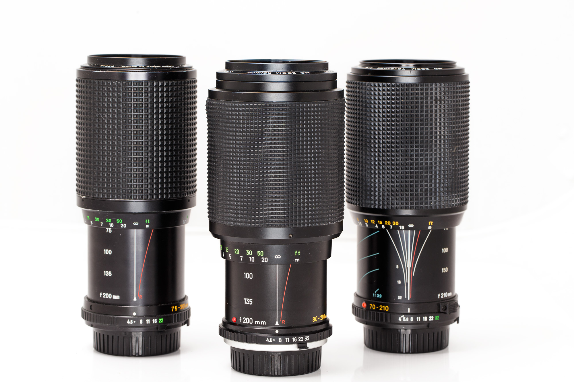 Das Objektiv im Kreise seiner Nachfolger MD Zoom Rokkor 75-200 mm f/4,5 (links) und MD Zoom 70-210 mm f/4 (rechts).
