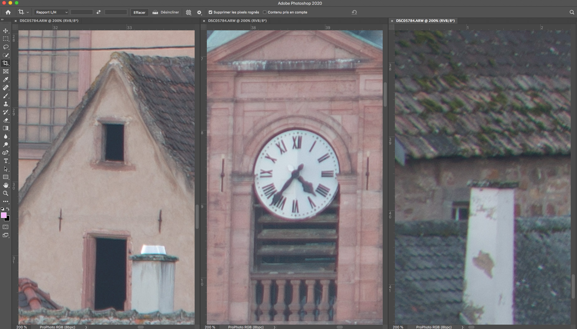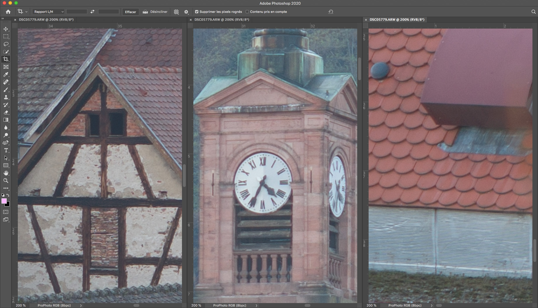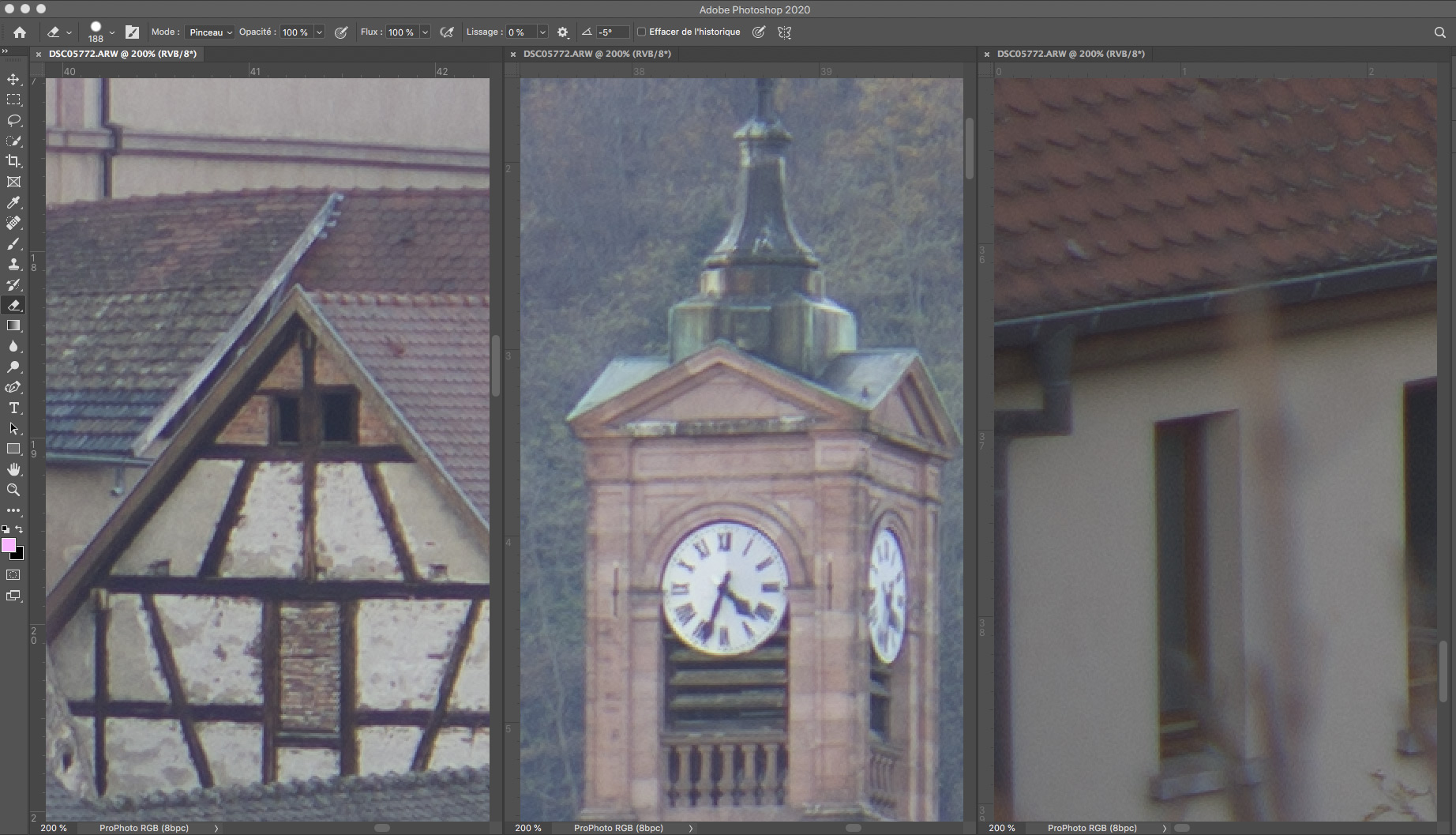 Ausschnitte (200%) : Mitte (links), erweitertes Zentrum (Mitte) und Ecke rechts oben (rechts)