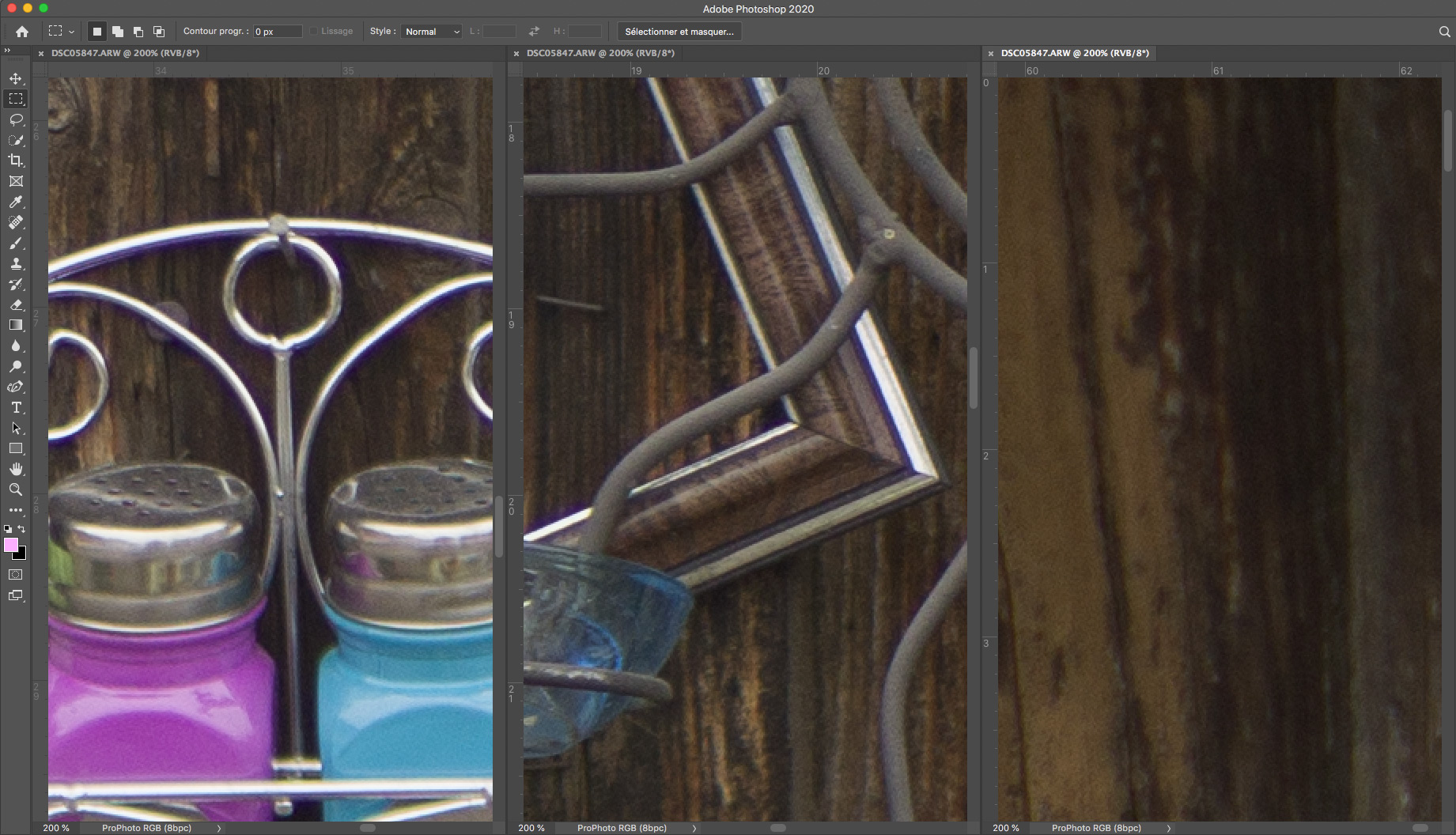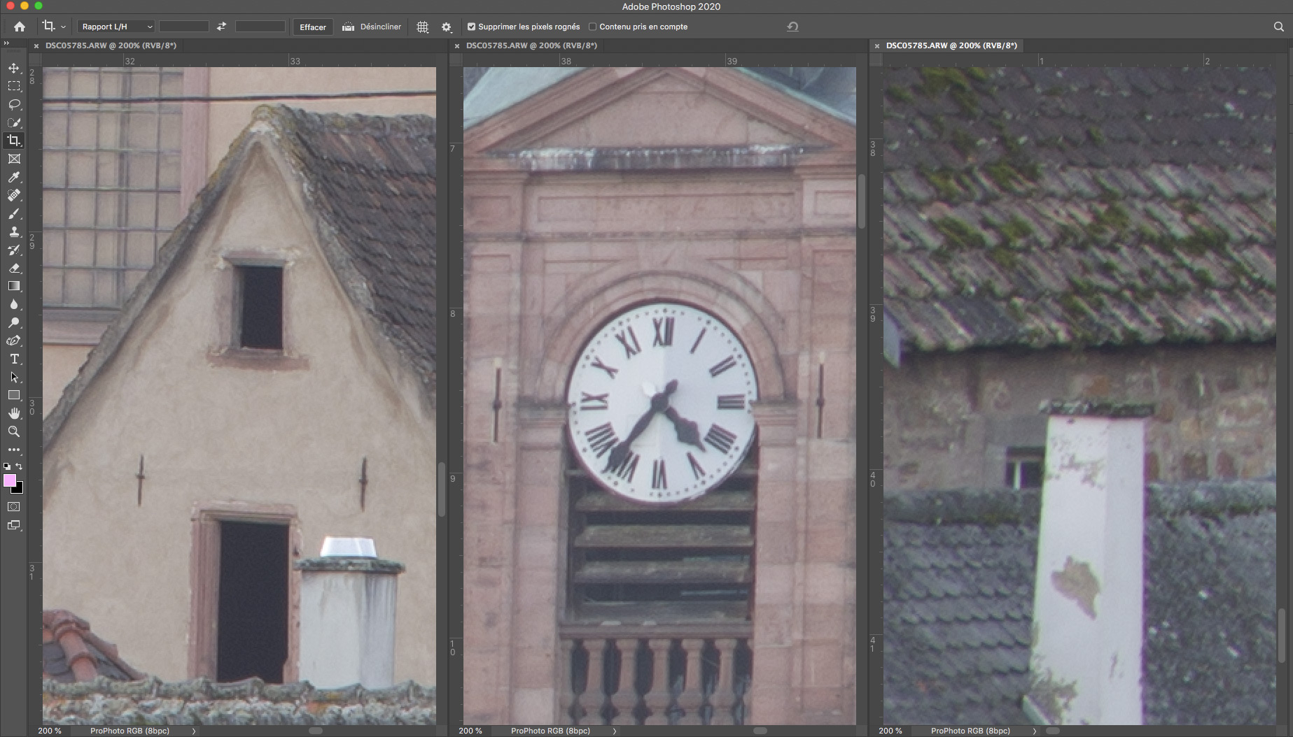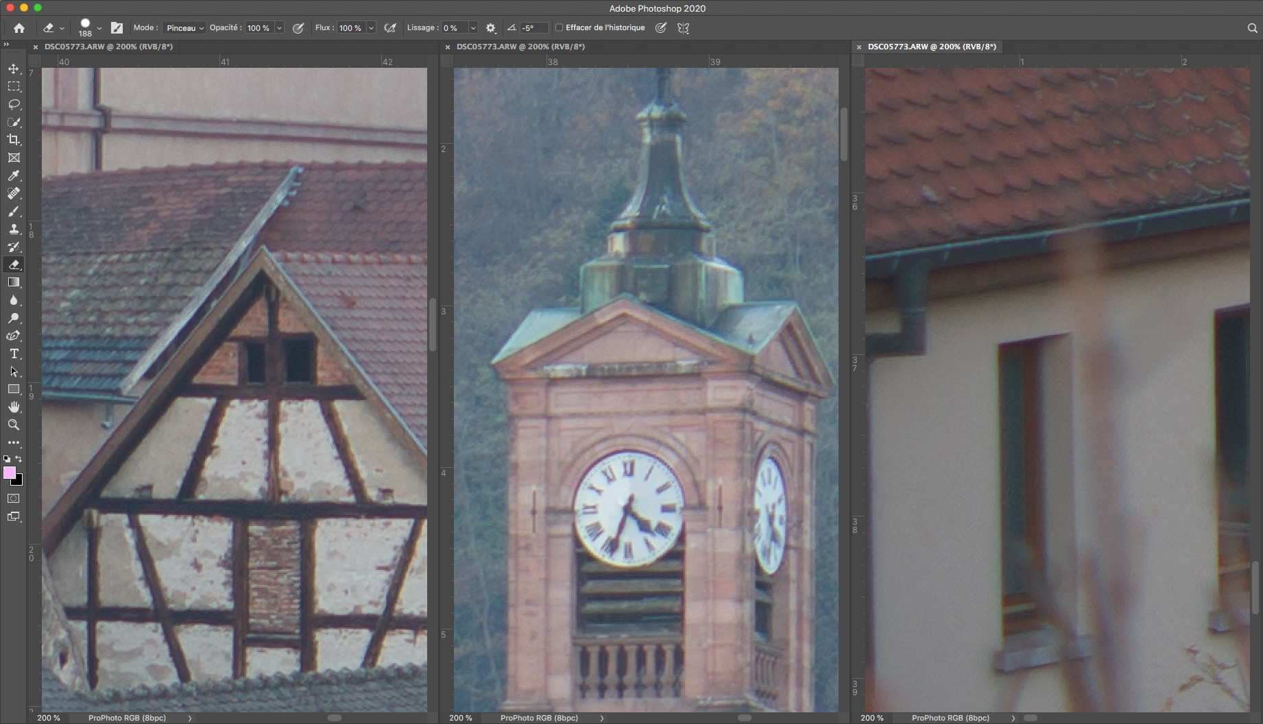 Ausschnitte (200%) : Mitte (links), erweitertes Zentrum (Mitte) und Ecke rechts oben (rechts)