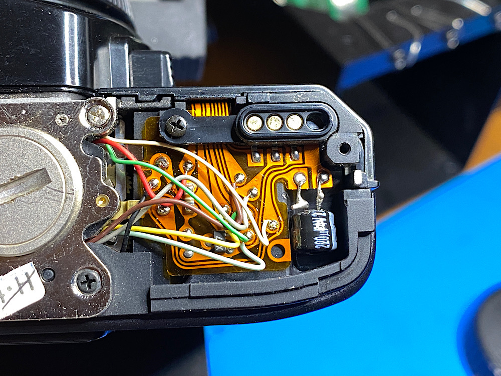Die Ursache kann der Elektrolytkondensator im Boden der Kamera sein, der nach Jahrzehnten nicht mehr will. Entweder läuft sein Elektrolyt aus und versaut die zarte flexible Platine, oder er stirbt ohne äußere Anzeichen.