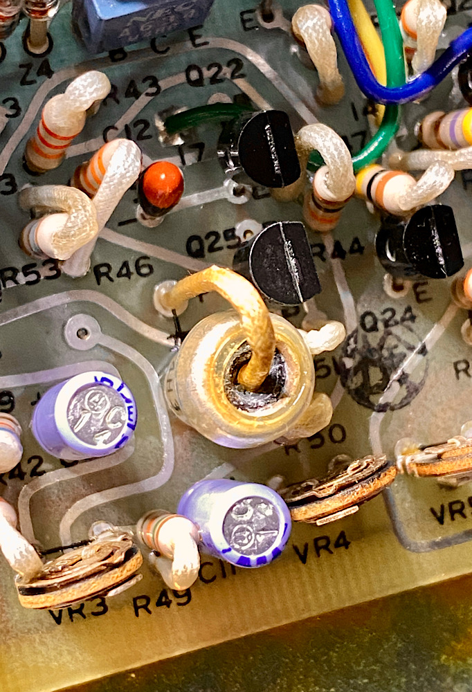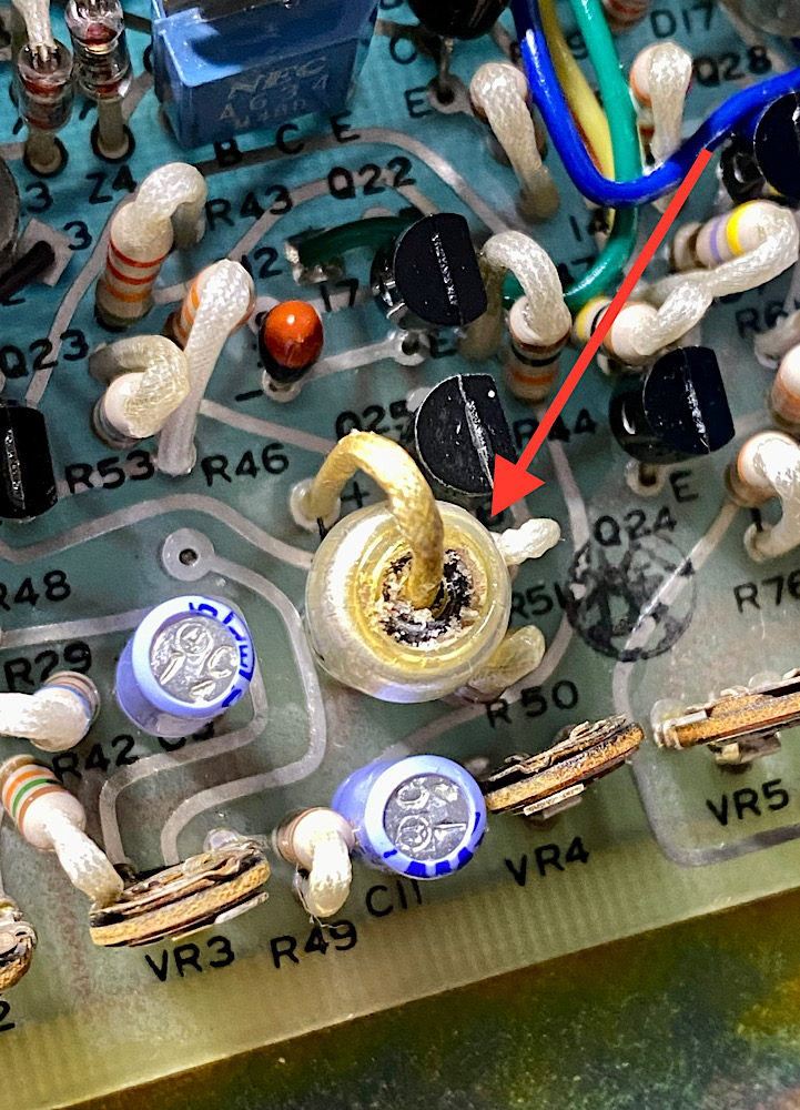 Bei der Kontrolle der Platine mit der Kopflupe sehe ich kristalline Ablagerungen auf drei Kondensatoren.