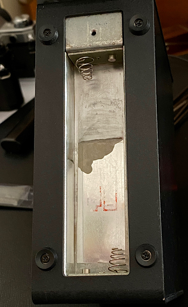 Das Metall hat im Durgol-Bad keinen Schaden genommen. Lediglich die roten Batteriesymbole im Batteriehalter haben sich verdünnt. Aber die Polarität, also wie die Batterien einzulegen sind, ist gegen Licht noch zu erkennen.