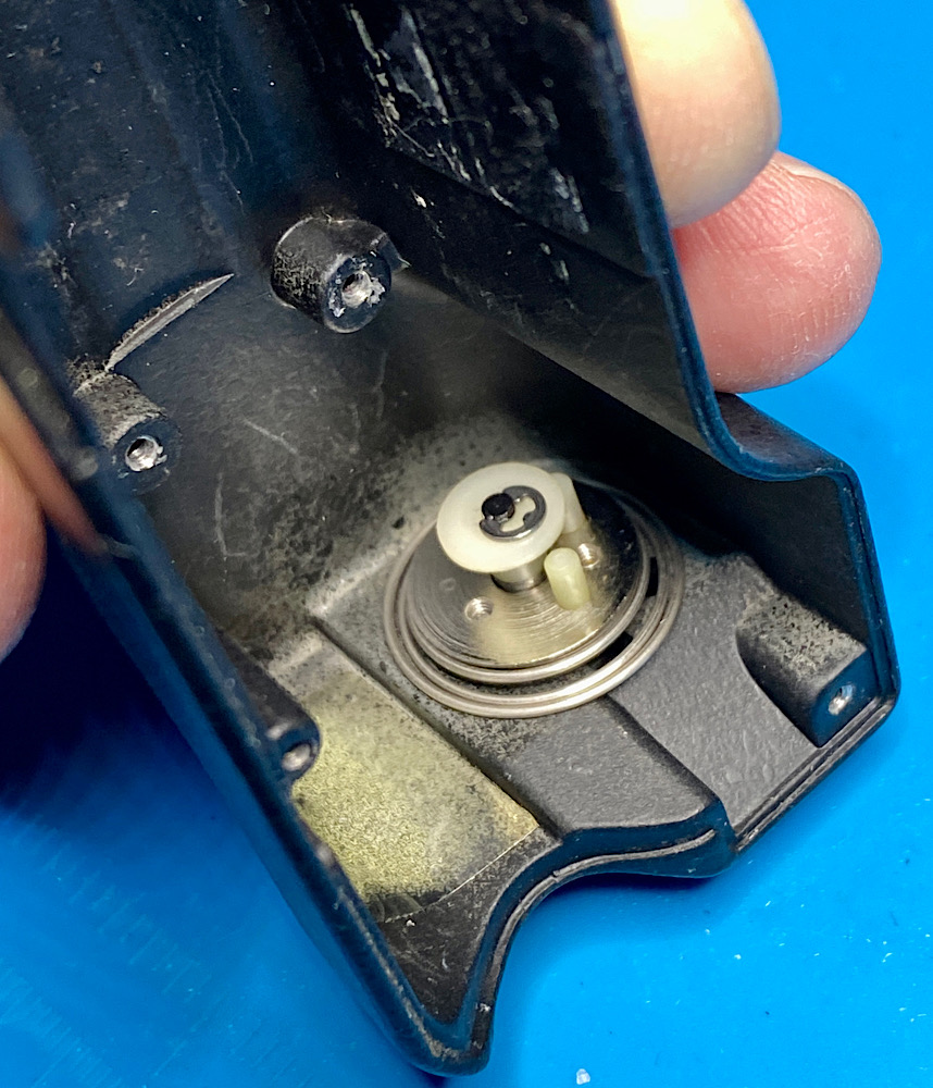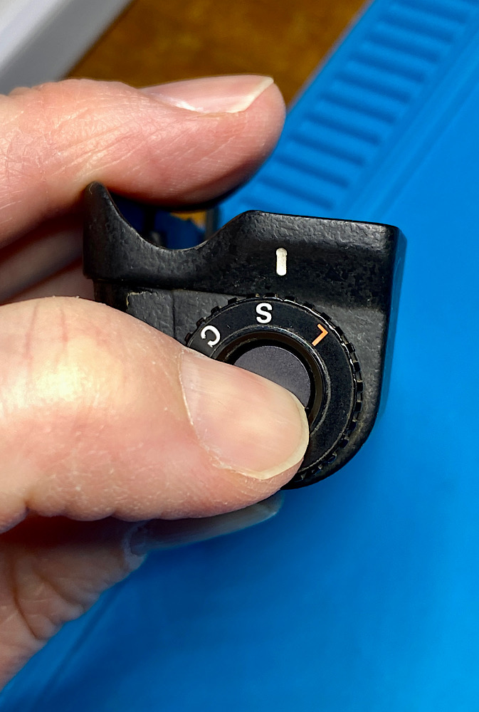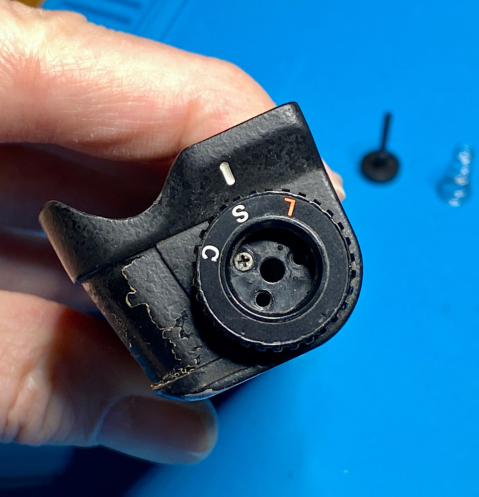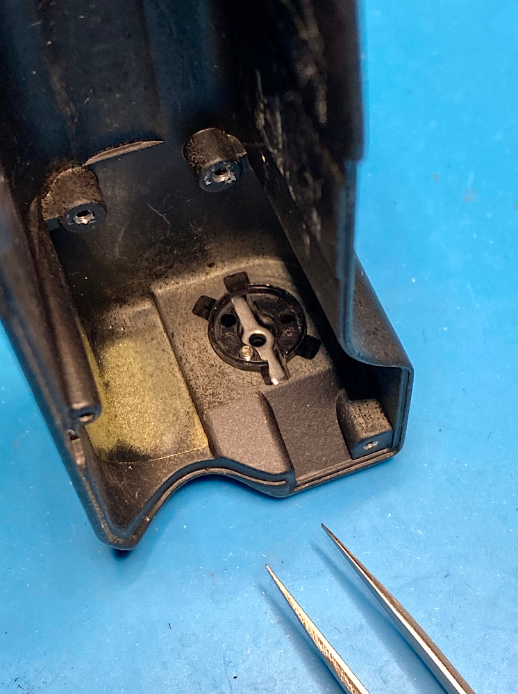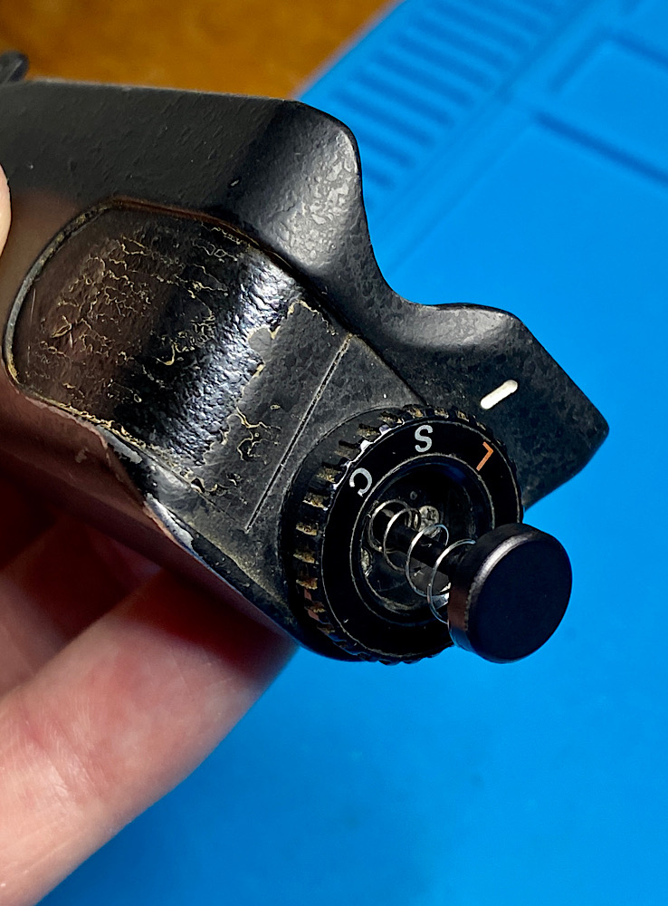Hier der Ablauf, wie der kombinierte Auslöseknopf/Motorwahlschalter wieder an seinen Platz oben am Griff des MD-4 kommt.