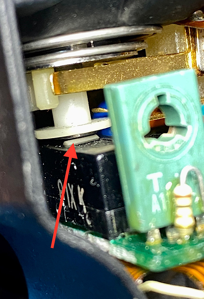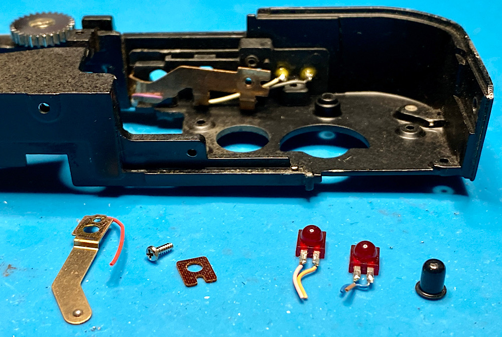 Hier die LED ausgebaut, rechts der Druckknopf, links und im Hintergrund Teile des mechanischen Schalters: