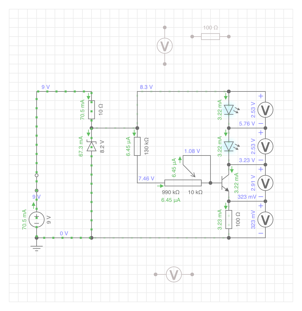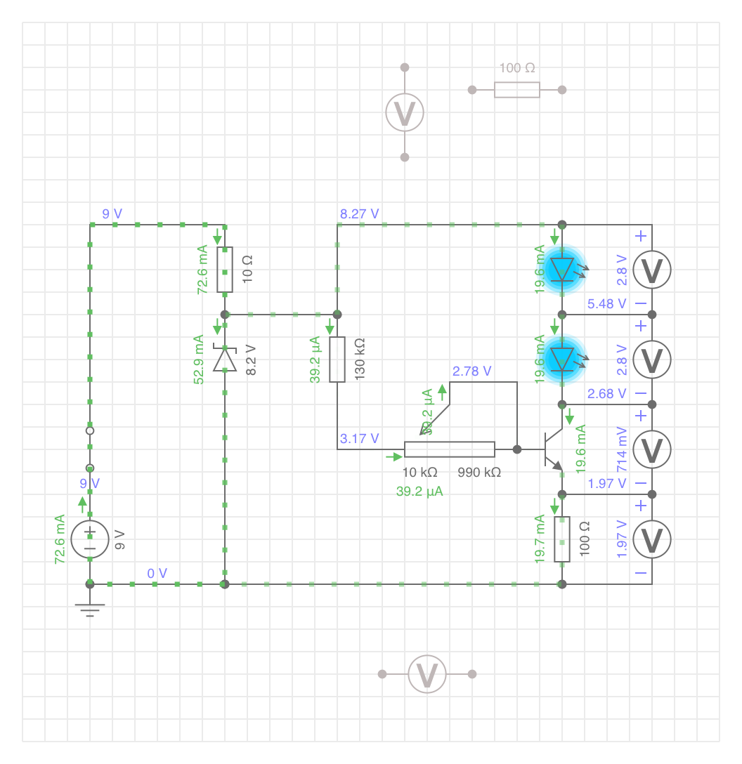 Vielleicht sollte ich mich nicht alleine auf die Kollektor-Emitter-Strecke des Transistors verlassen, die in der Simulation einen (LED)Strom begrenzenden Widerstand bildet.