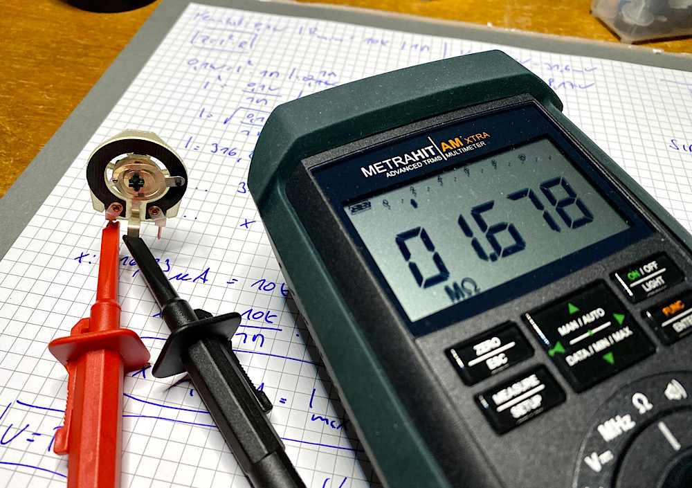 Die kleinere Ausführung hier auf dem Bild verträgt nur 0,1 W. Und das geht sich mit dem maximalen Strom, der durchfließen soll, nach meiner Berechnung nicht aus. Das Poti könnte überlastet werden.